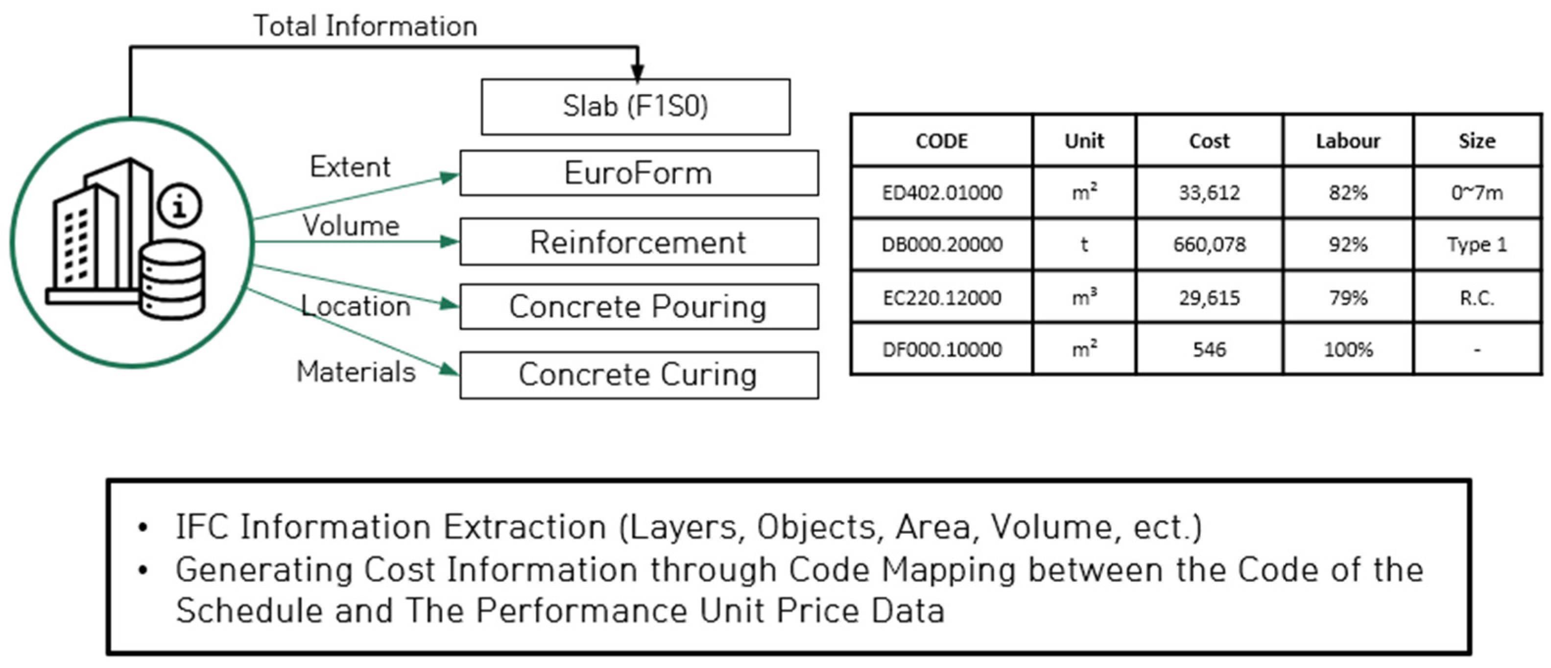 It should be noted that not all construction activities are explicitly modeled as independent BIM objects. Certain temporary works, such as formwork, may not exist as standalone entities within the IFC model. In the proposed system, these items are not manually estimated; instead, their quantities are automatically derived using embedded calculation formulas based on the geometric properties of structural elements.