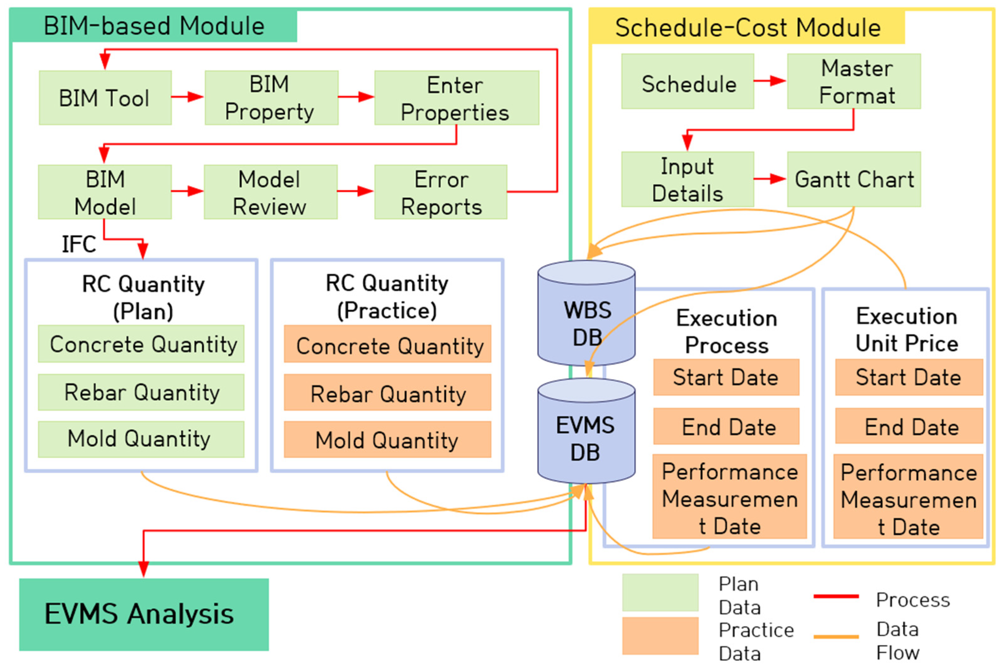The method proposed in this study is to analyze EVM by performing process–cost integrated management with a single model through the extraction of schedule and quantity information from the IFC model and proceeds with the following process: first, an IFC model is created in the BIM tool by inputting a classification code to link schedule and cost information; second, the extracted quantity information is linked with the performance construction cost database to generate planning cost information and is linked with the classification code created in the model object and the schedule information created in the process creation software; third, a mapping table is created for the code mapping of the extracted process and cost information; fourth, performance information is generated by updating execution schedule and cost data based on actual construction progress, and the updating process is implemented in a semi-automated manner: object-level quantities are automatically retrieved from the IFC model through predefined property sets, while actual progress and incurred cost data are periodically entered and synchronized with the scheduling and cost management systems; fifth, performance versus plan is measured using the EVMS. This approach enables near real-time performance monitoring while maintaining practical applicability in typical construction environments where full automation of field data acquisition is not yet feasible. To ensure data consistency, classification codes embedded in the IFC objects are used as matching keys for linking schedule and cost records, and discrepancies in quantity or code mapping are identified through rule-based verification procedures before EVMS calculations are performed.