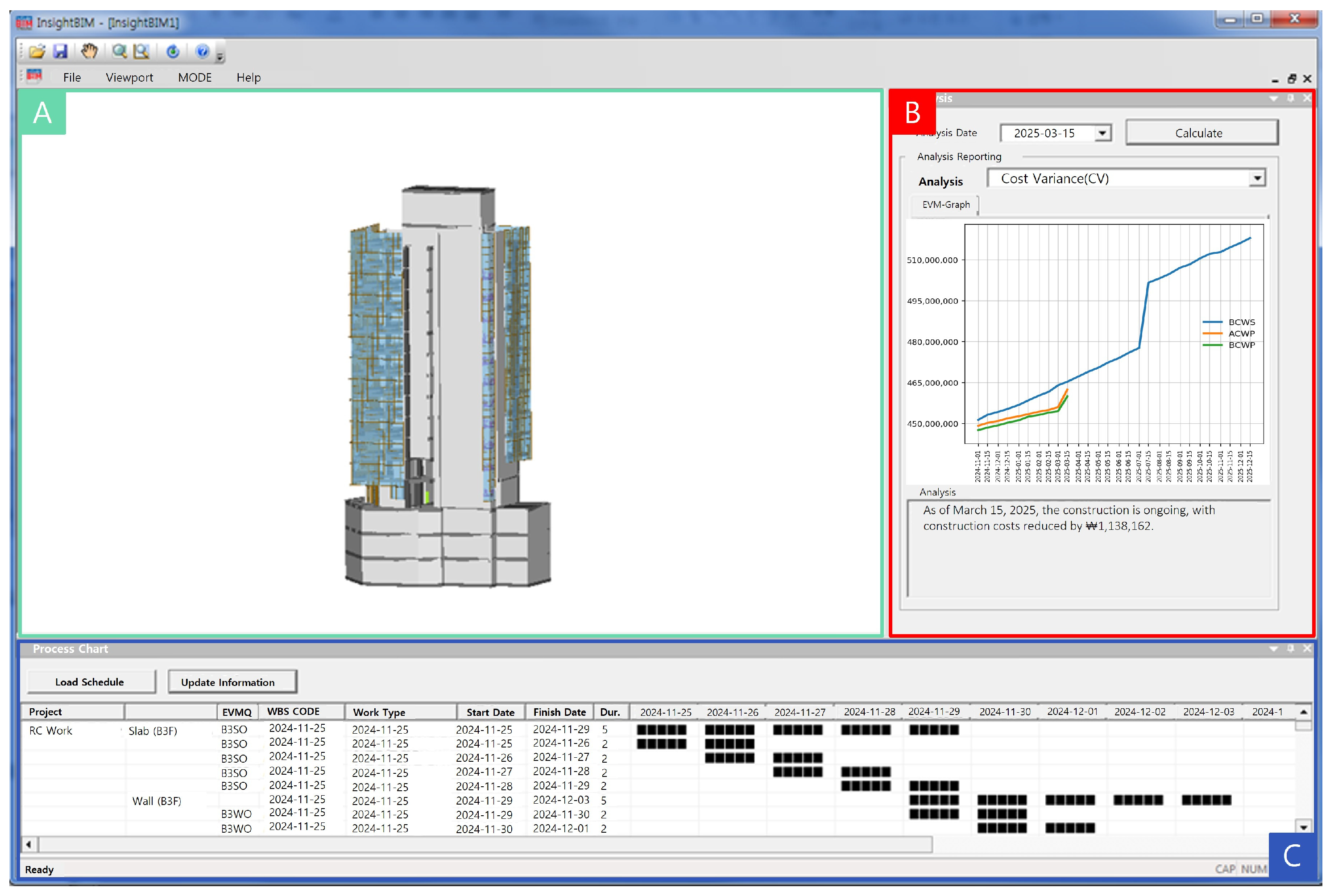 The EVM system interface layout developed in this study consists of a 3D viewer, model properties, schedule, and EVM analysis results window required for BIM-based EVM analysis.