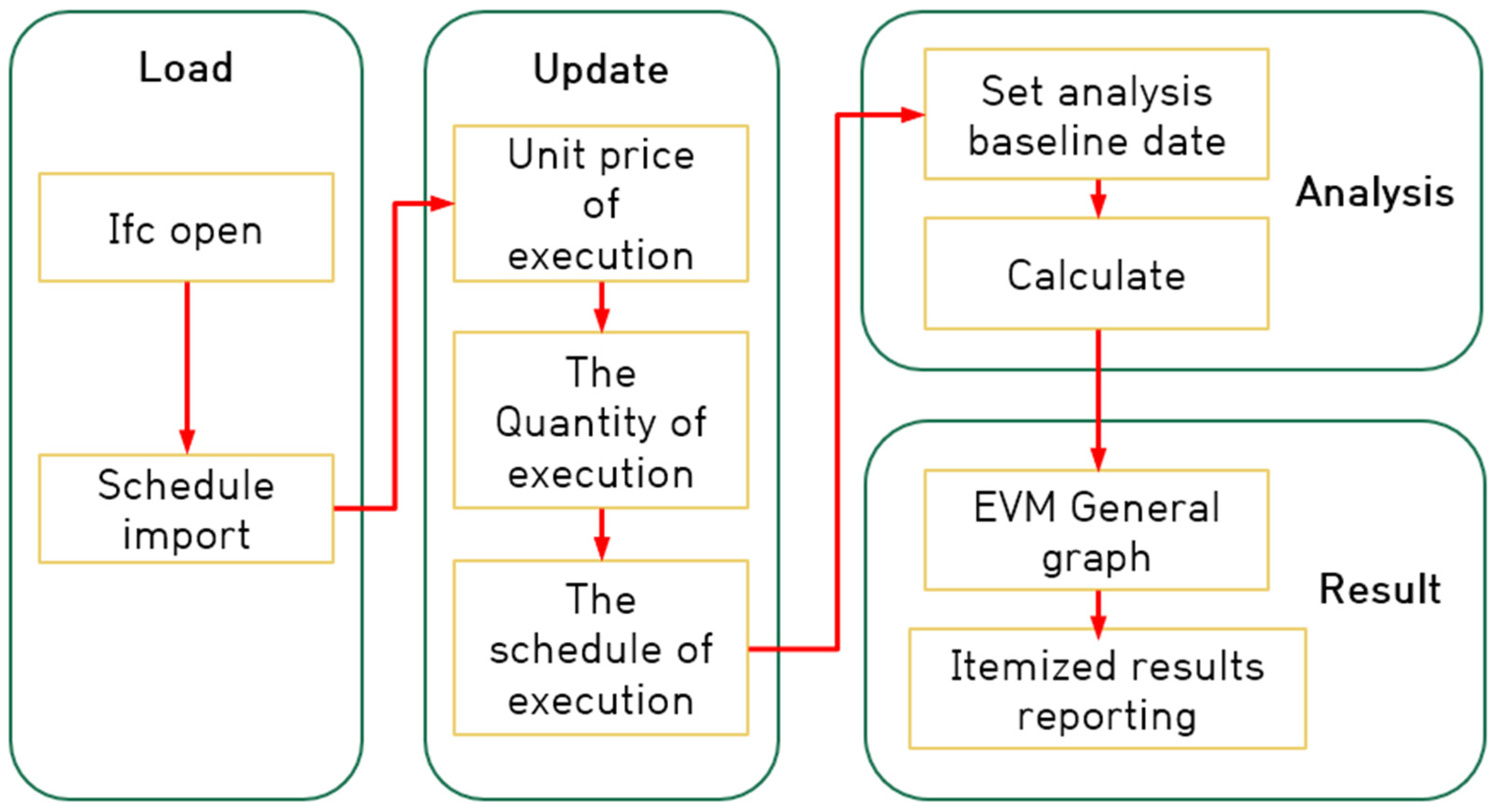 The system can be divided into four stages: planning the information load, executing the information input, analysis, and result extraction. In the planning information load step, the prepared IFC file is opened, and the planning information is stored by importing the planning schedules. In the execution information input step, the execution information is stored by updating the execution unit price, quantity, and schedule information in the actual field. The analysis step involves setting and calculating an analysis reference date based on the plan and execution information. The last result extraction step is the step in which the calculated EVMS analysis results report the general graph of the EVMS and the results of each analysis item to perform a performance analysis.