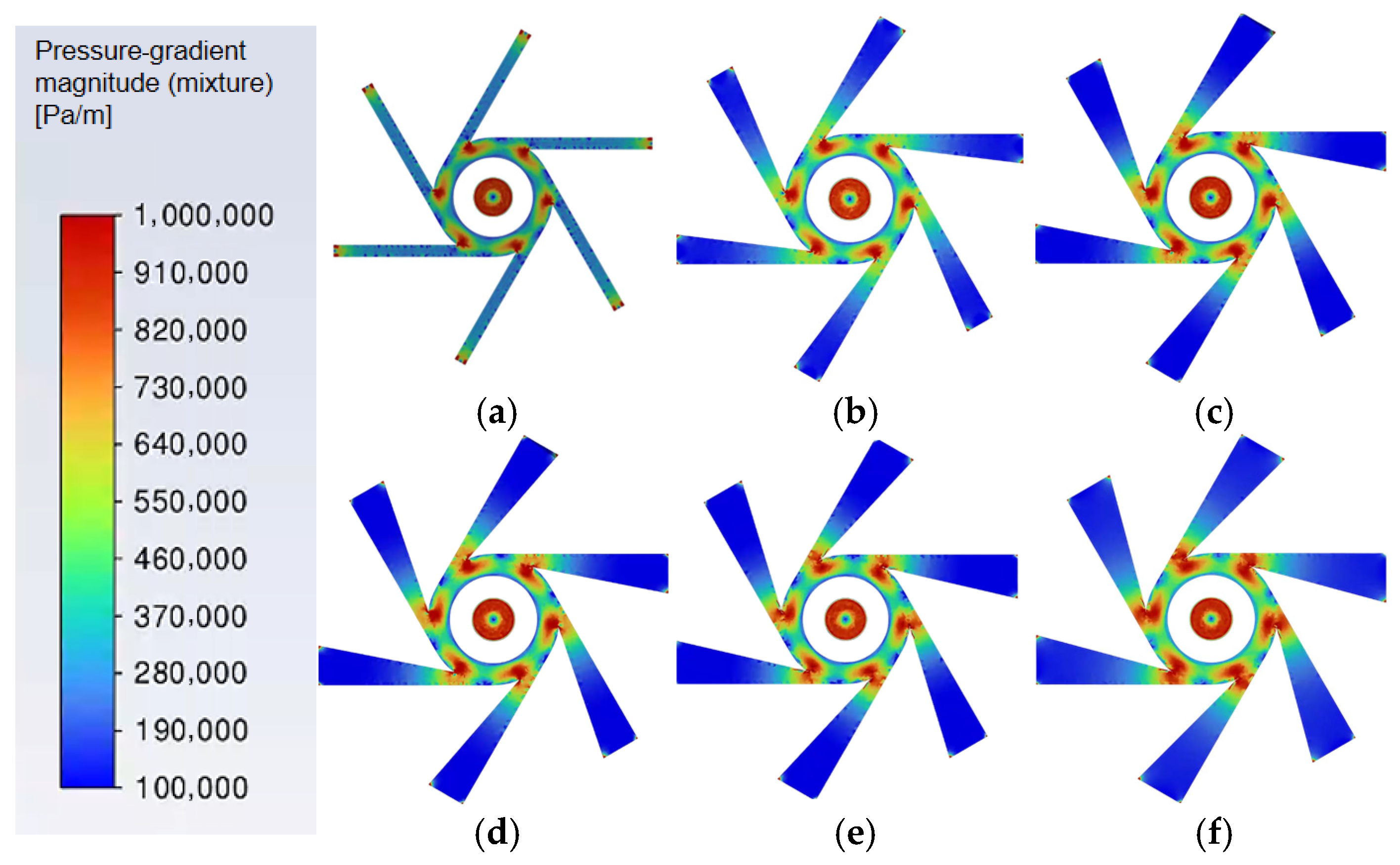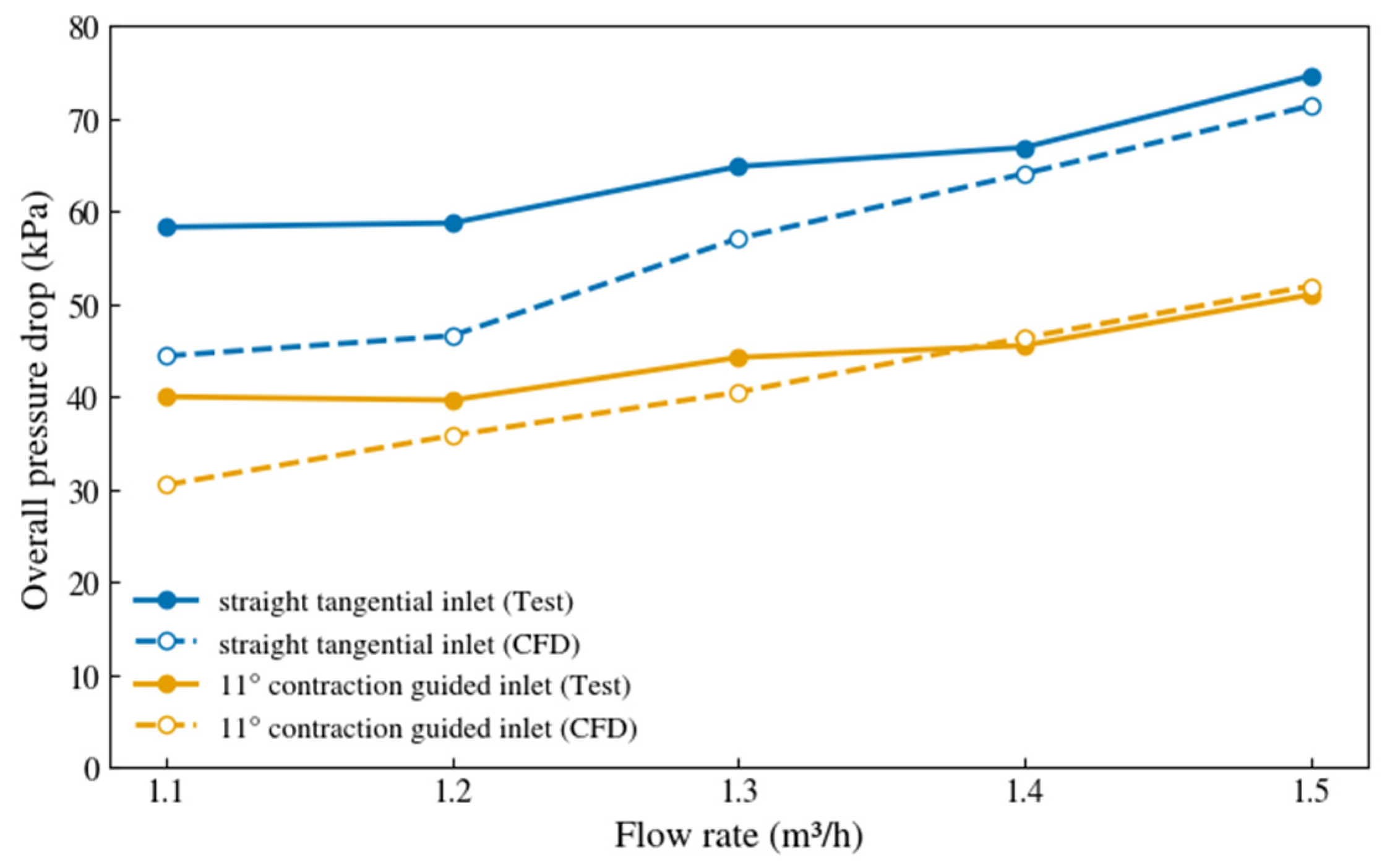 - The multi-flow-rate tests show that the overall pressure loss increases monotonically with flow rate, and the simulations reproduce the same trend. For the 11° inlet, the relative error decreases from 23.78% at 1.1 m3/h to below 2% at 1.4–1.5 m3/h. For the straight tangential inlet, the relative error decreases from 23.84% at 1.1 m3/h to about 4.22–4.33% at 1.4–1.5 m3/h, which supports the applicability of the numerical approach for capturing the pressure-drop evolution across the investigated flow-rate range.