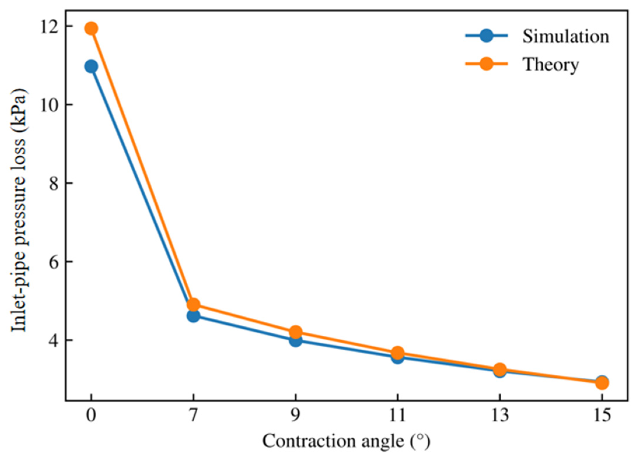 - An engineering implication is that inlet-structure optimization should be guided by a combined criterion that includes pressure-loss reduction, the diminishing-return knee behavior, and flow field constraints. Optimization should not rely solely on increasing the contraction angle, because an overly large angle may yield limited additional pressure-loss reduction and increase the risk of unfavorable flow structures.