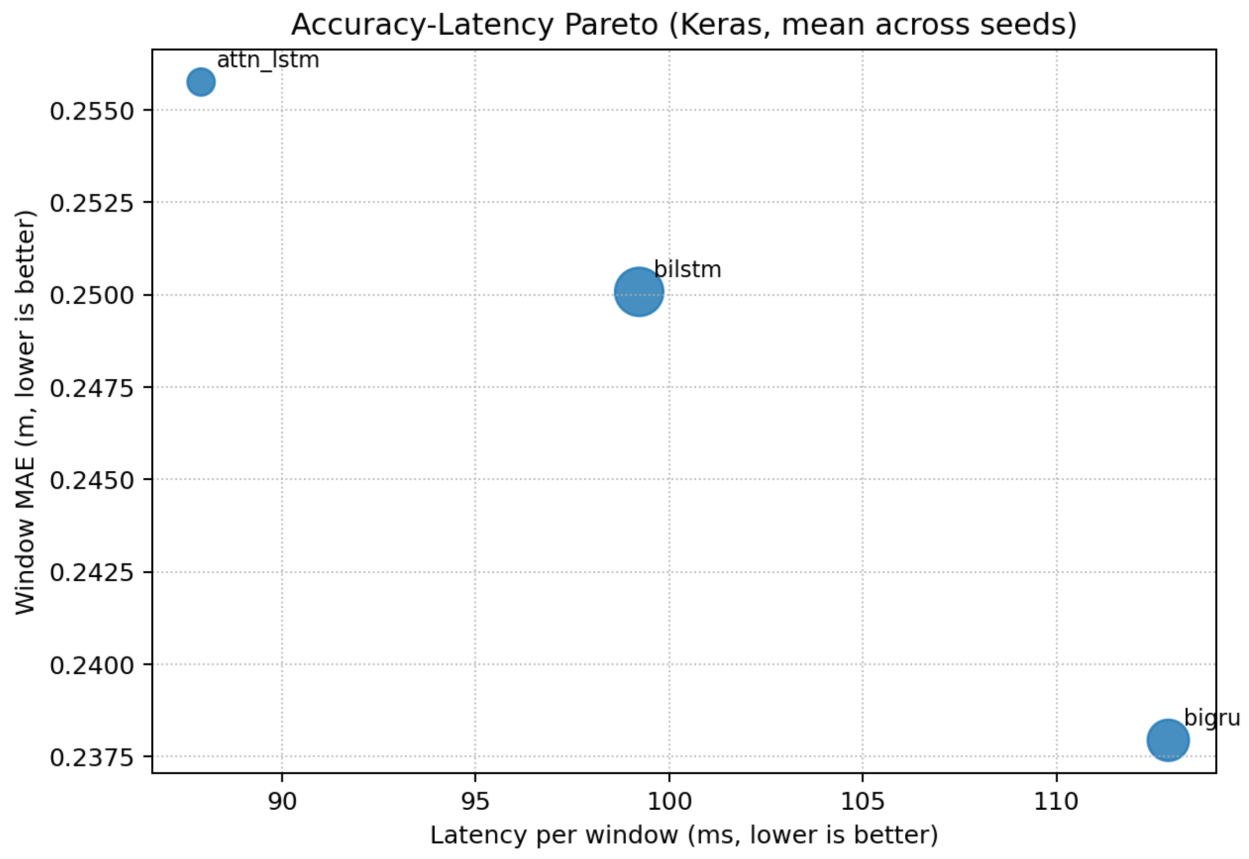In this supplementary comparison, BiGRU attains the lowest error, while the proposed Attention-LSTM remains the fastest and most compact among the three compared architectures and is close to BiLSTM in accuracy. To make this trade-off explicit, we provide an accuracy–latency Pareto visualization (