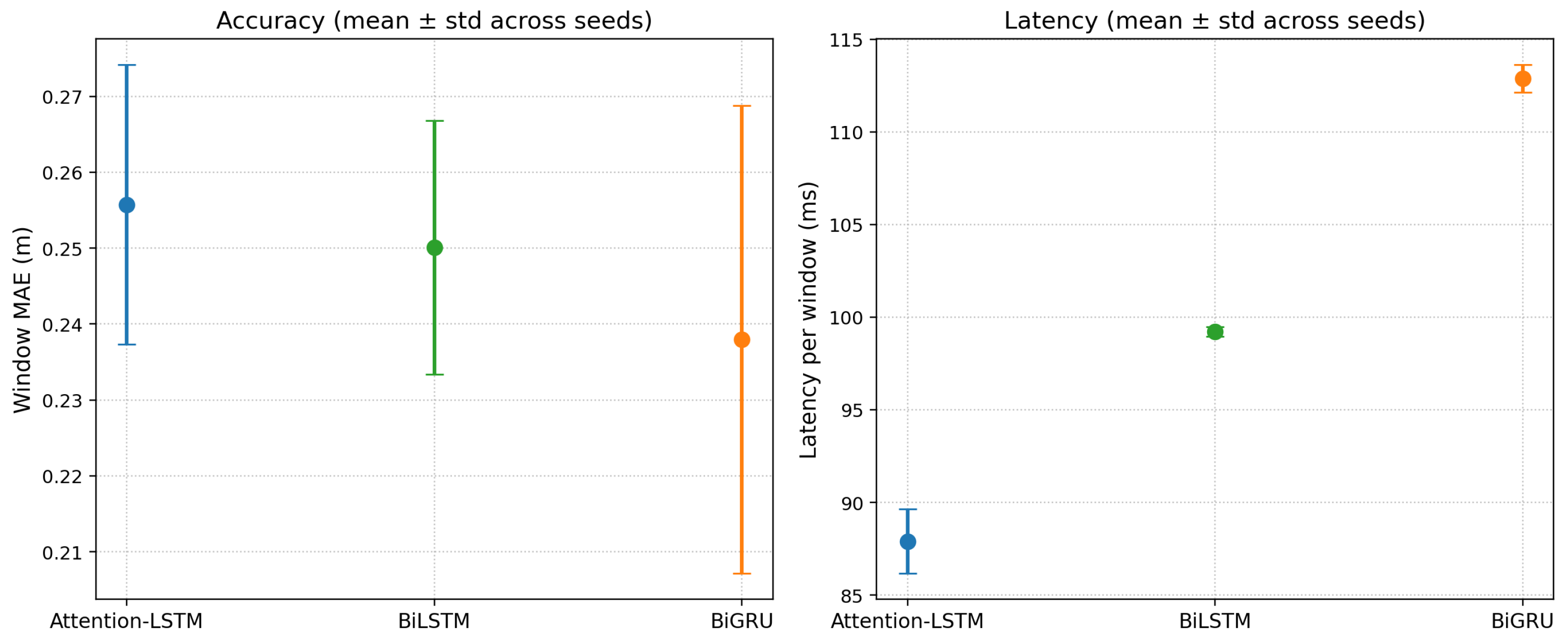 In this comparison, additive attention achieves lower MAE but with substantially higher latency, whereas scaled dot-product attention improves error over the no-attention baseline with only a small latency increase (Keras: 0.334 → 0.253 m, 80.13 → 82.37 ms; TFLite FP32 latency: 10.37 → 10.50 ms). Given the edge-oriented objective of this study, we selected scaled dot-product attention as a practical accuracy–latency compromise.