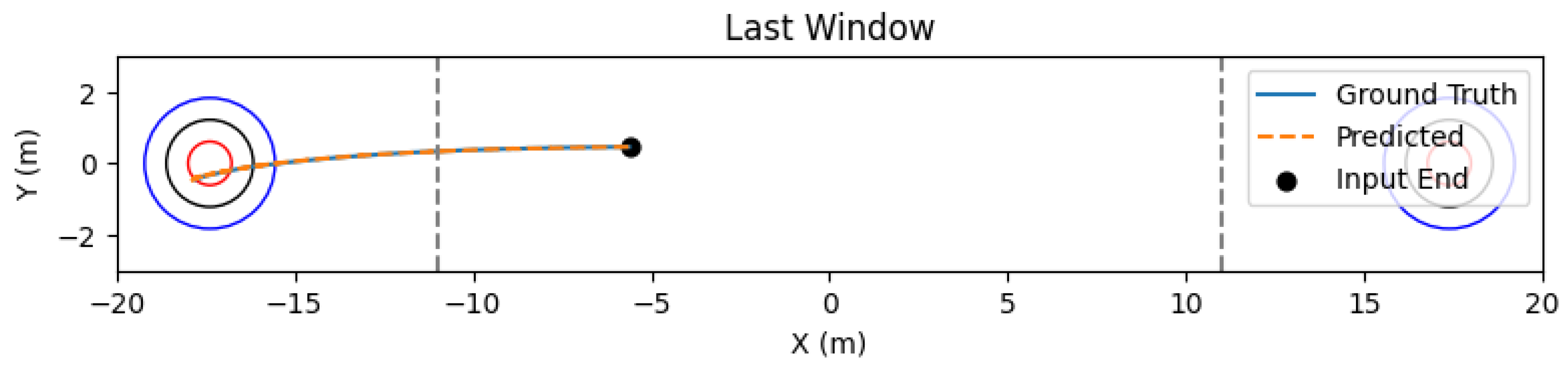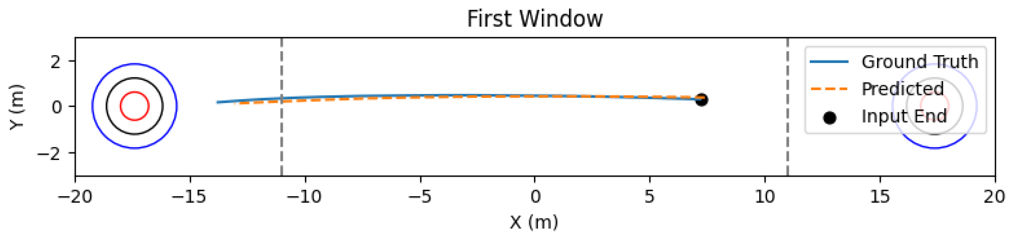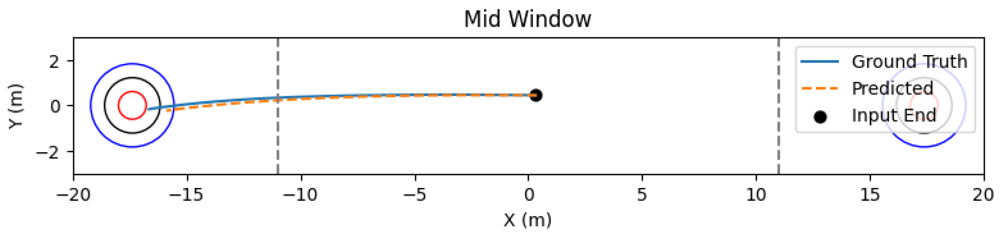 Motivated by the characteristics of curling delivery and expert feedback, we adopt a two-checkpoint analysis. Specifically, we report Mean Absolute Error (MAE) and Median Absolute Error (MdAE) at the initial forecast step and at the midpoint of the prediction horizon, in addition to full-trajectory statistics. Both “first-step” and “mid-step” errors are computed per sliding window and then aggregated across all windows in the test split. We also generate continuous trajectory predictions for qualitative inspection (