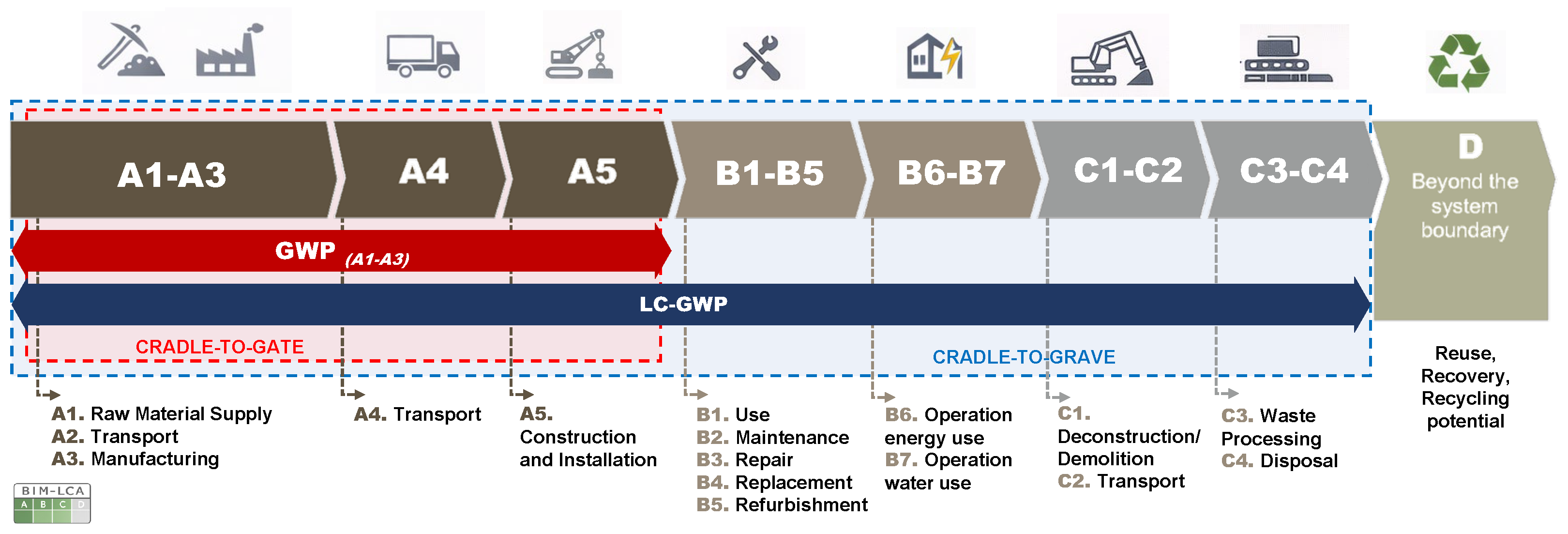 Life-cycle global warming potential (LC-GWP), also referred to as Whole Life Carbon, is a quantitative metric used to assess a building’s contribution to global warming by accounting for carbon emissions across its life-cycle, including embodied emissions from material production, construction, and end-of-life processes, as well as operational emissions arising from energy use during its service life [
