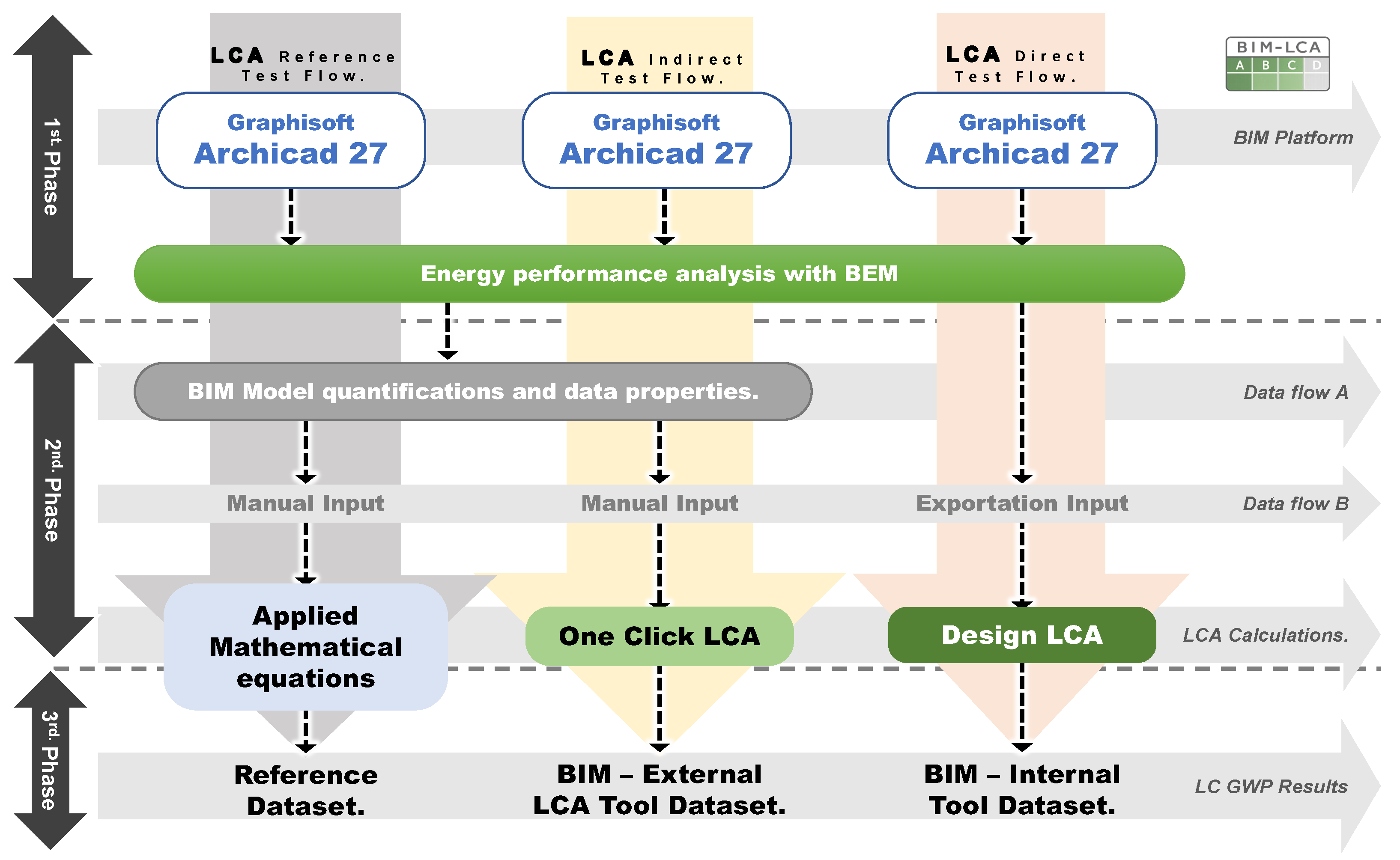 Figure 2): a reference calculation based on explicit equations, an indirect BIM-to-external workflow using One Click LCA (OCL), and a direct BIM-integrated workflow using DesignLCA (DLCA). The methodological conclusions derived from this phase were previously presented in a preliminary form at an international conference.