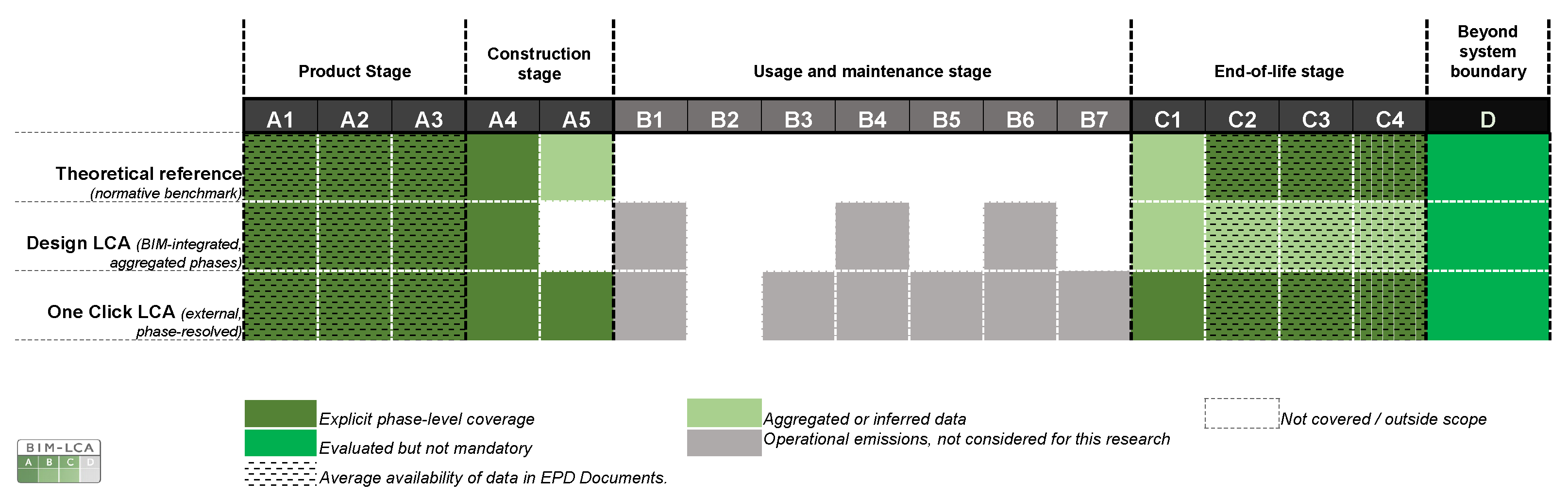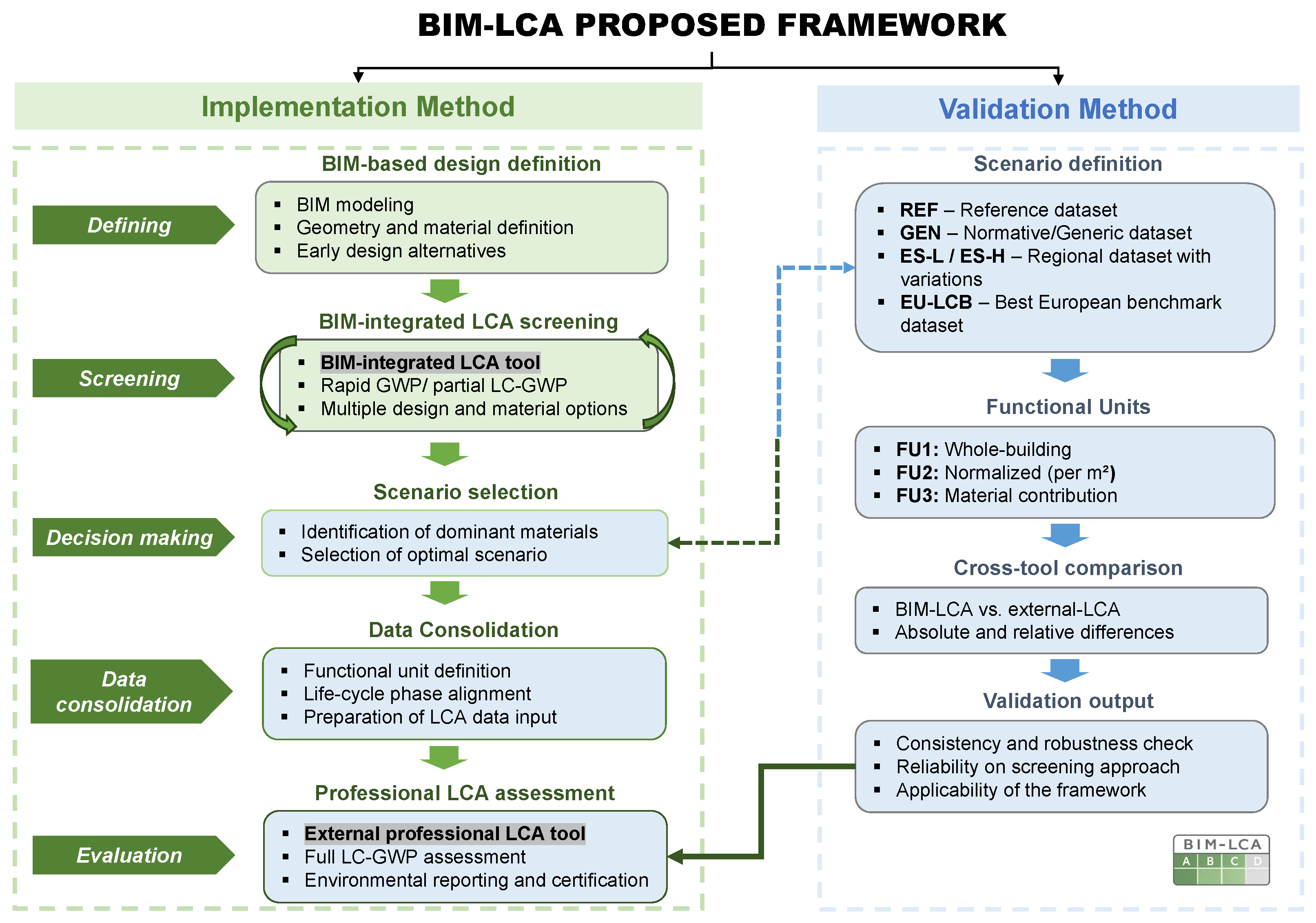 Implications for practice and future research. The framework supports the integration of embodied carbon assessment into BIM-based workflows and contributes to alignment with emerging European regulatory requirements, including EPBD-driven LC-GWP evaluation. Beyond methodological validation, the proposed workflow introduces a tiered assessment structure in which preliminary carbon screening can be performed directly within the BIM environment by architects or modelers, enabling the rapid comparison of alternative material configurations during the early design phases. This redistribution of analytical tasks reduces iterative delays and procedural bottlenecks, while reserving detailed modeling, full life-cycle validation, and regulatory reporting for specialized LCA practitioners. In this sense, the framework enhances efficiency without replacing expert evaluation, instead structuring it more strategically within the design process.