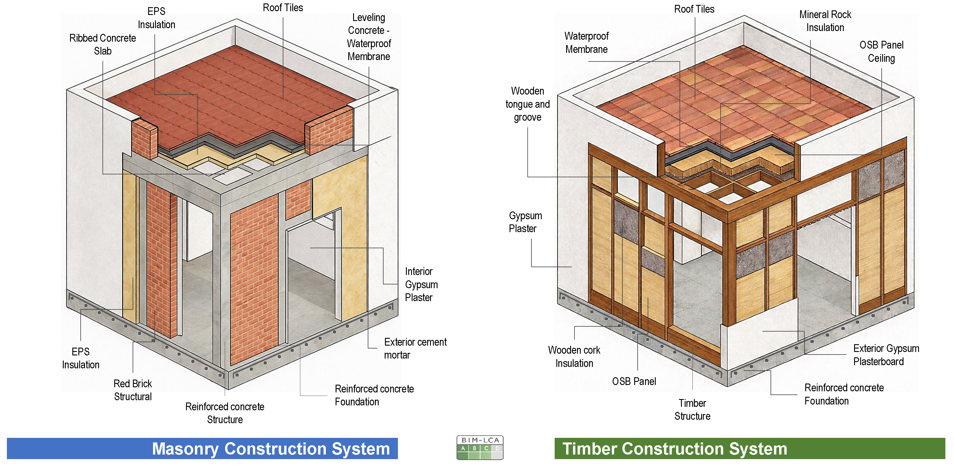 38]. The second configuration applies a timber-based construction system, consisting of a timber structural frame combined with oriented strand board (OSB) panels, gypsum plasterboard, and wooden flooring as the main building elements. This system was selected to provide a clear contrast in material composition and environmental performance, as timber-based solutions are frequently proposed as an effective strategy for reducing embodied carbon impacts, owing to their capacity for biogenic carbon storage and temporary carbon sequestration within the building fabric [