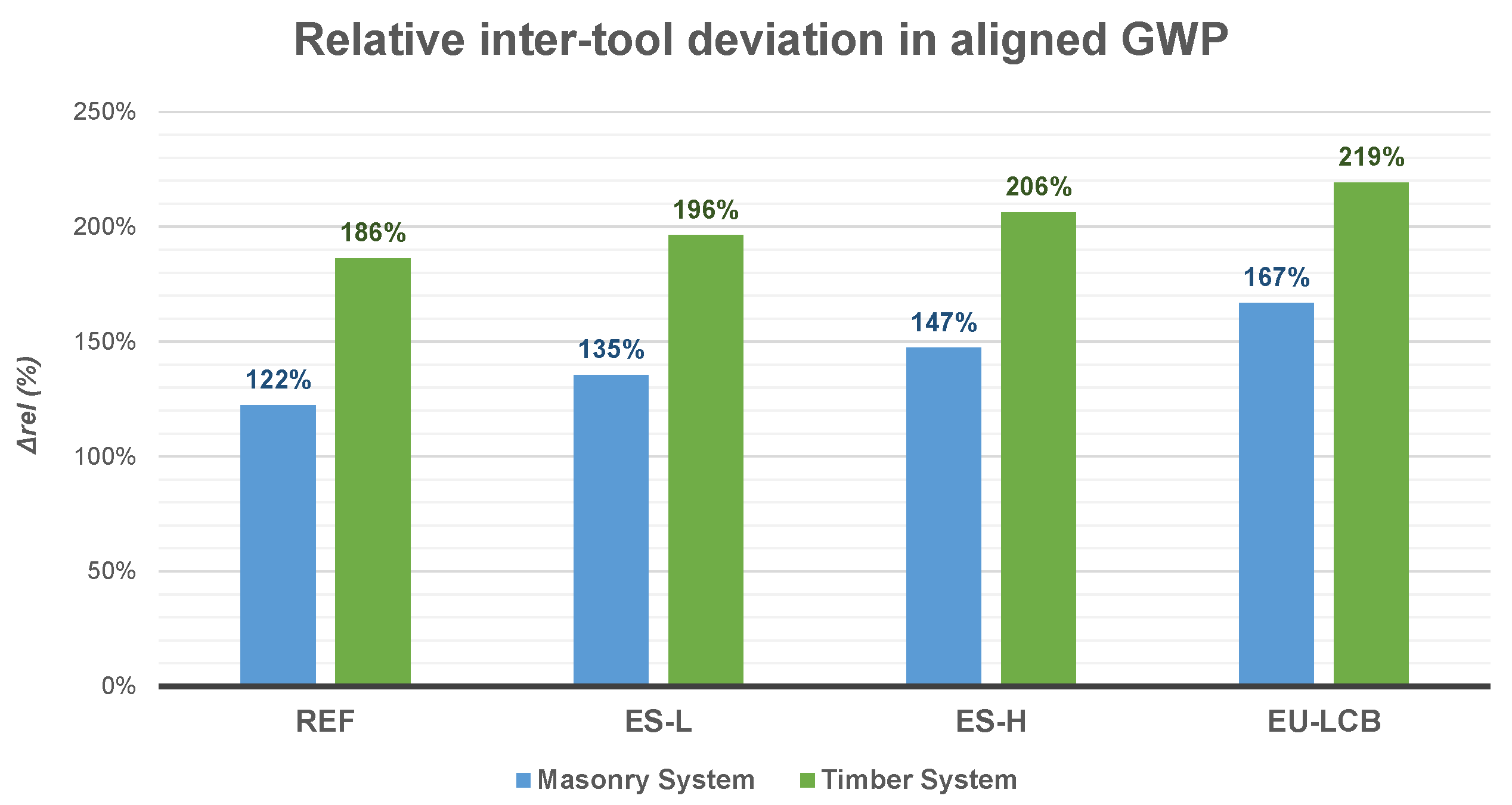 Figure 7, relative inter-tool deviations increase progressively across optimization scenarios for both construction systems. The magnitude of deviation is systematically higher for the timber system than for the masonry system while preserving a consistent monotonic trend across scenarios. This visual pattern confirms that, although the absolute and relative differences between tools are substantial, their evolution remains stable across material optimizations and functional units, reinforcing the internal consistency of the comparative assessment.