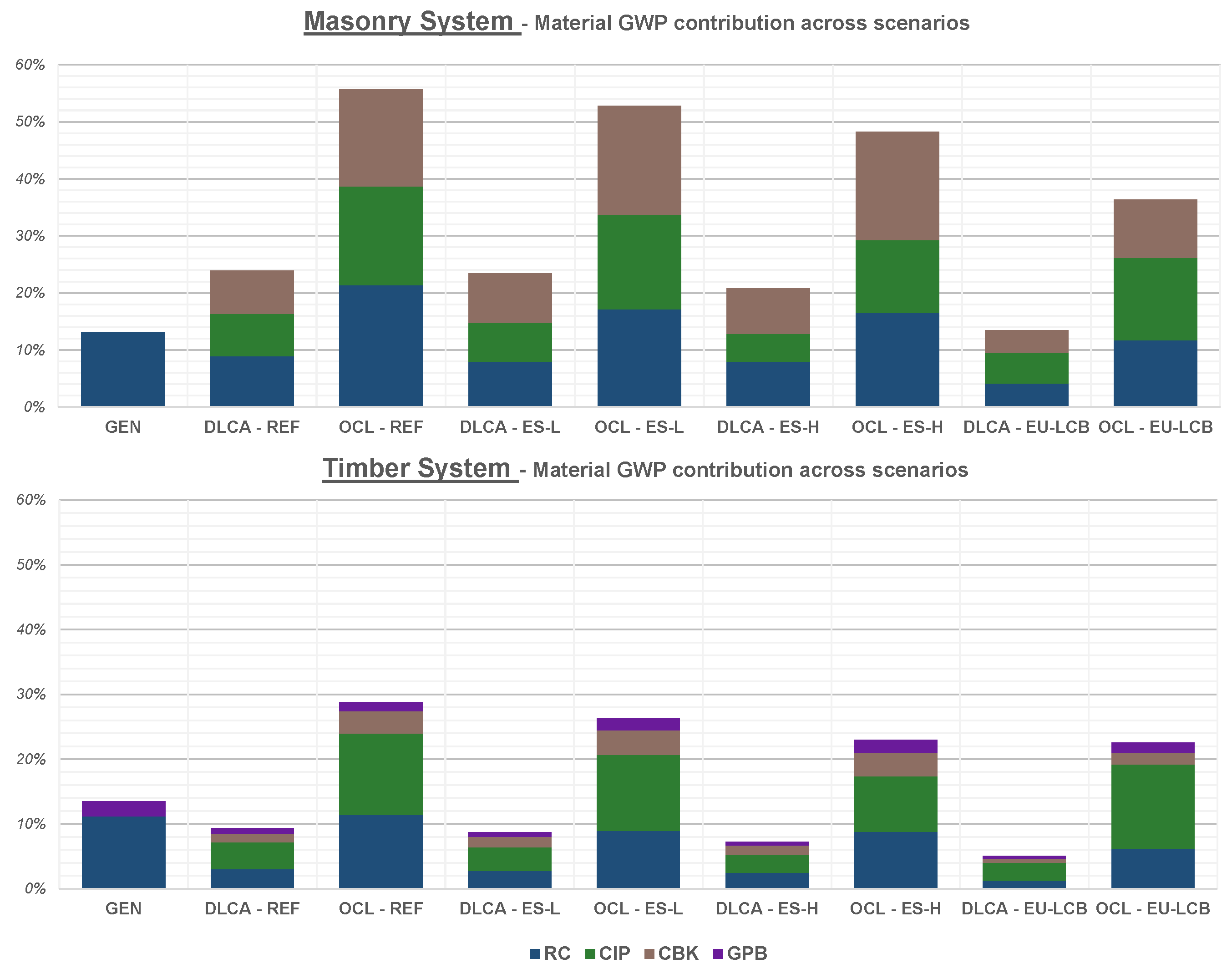 Figure 6, whole-building GWP intensity decreases progressively across scenarios for both construction systems. The largest reductions are observed for the EU-LCB configuration, while the timber system consistently exhibits greater relative improvements than the masonry system. Across all scenarios, the external professional LCA tool reports larger relative reductions in whole-building GWP intensity than the BIM-integrated approach, while preserving identical scenario rankings and relative performance trends.