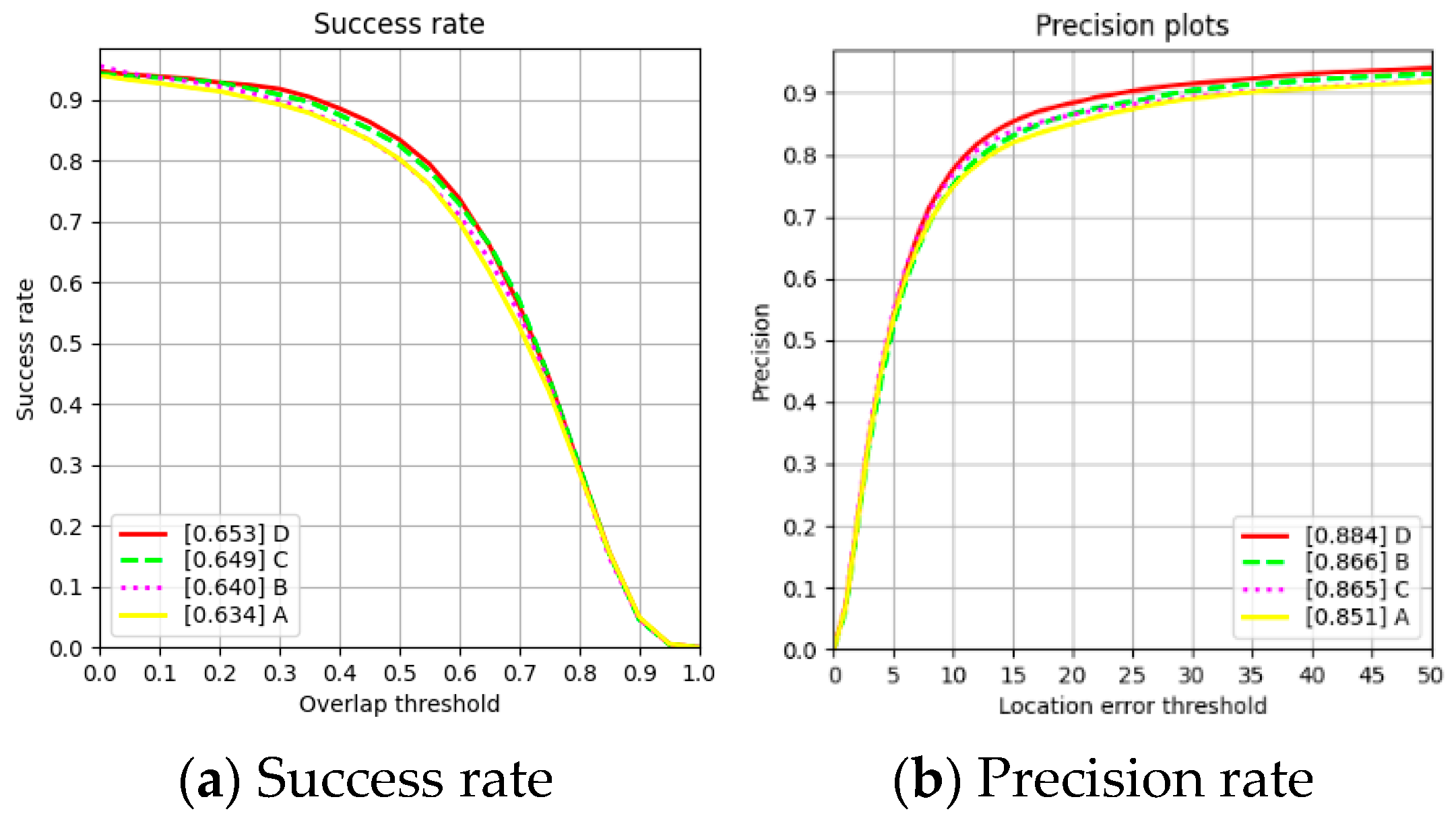 and the area under the curve (AUC) is used as the final success-score metric. A larger AUC indicates a greater area under the success plot curve, implying that the model performs more consistently and evenly across different threshold ranges.
