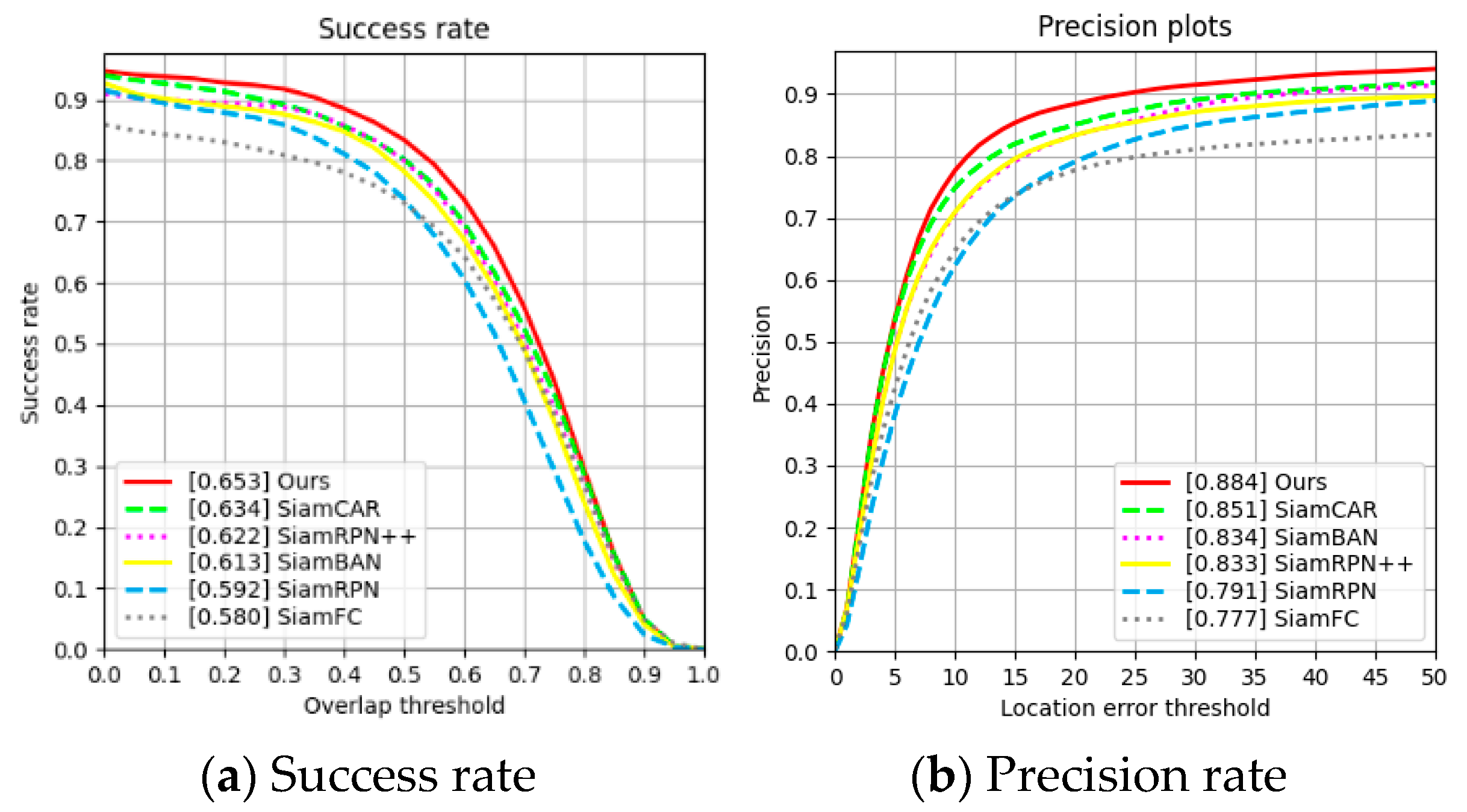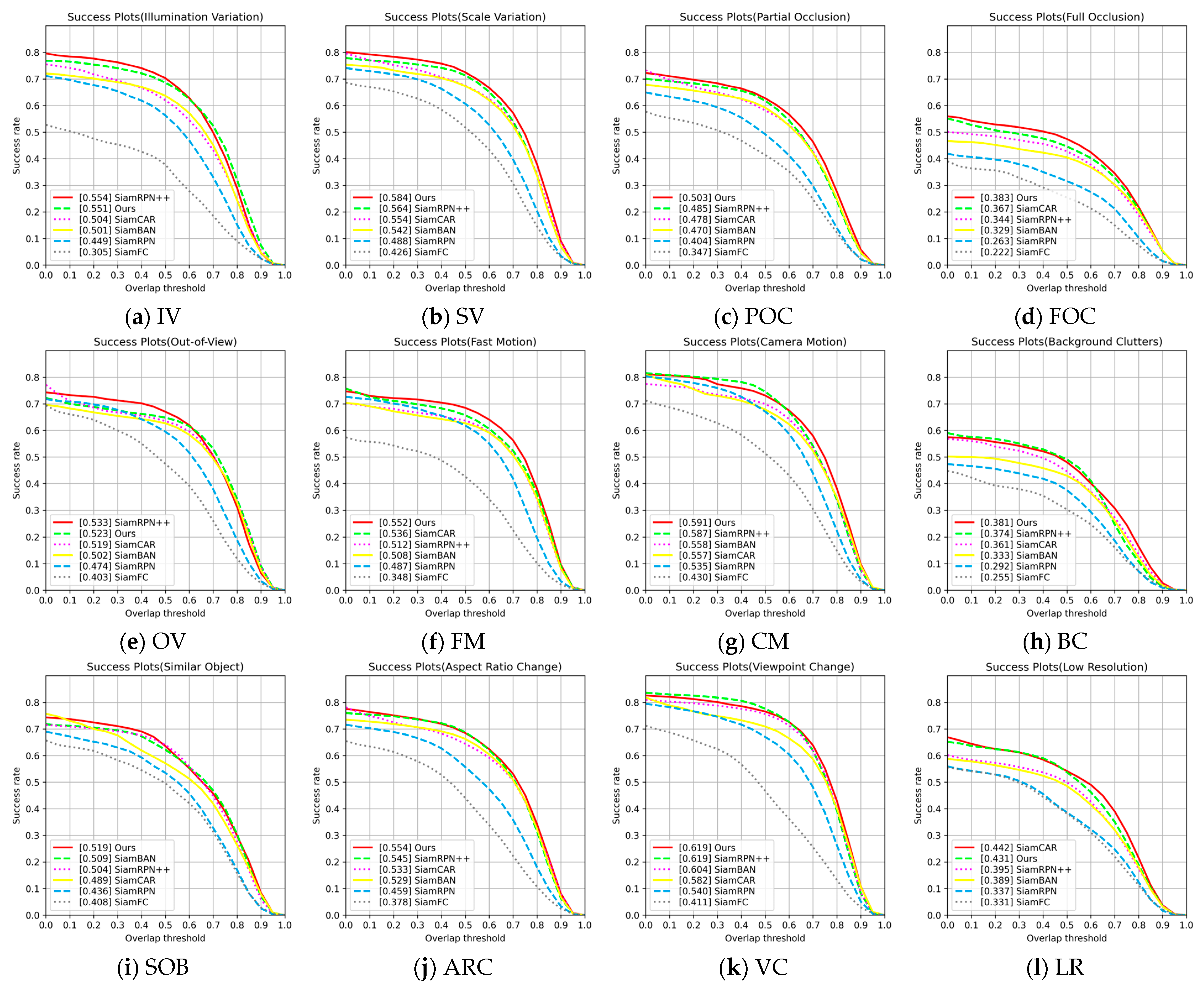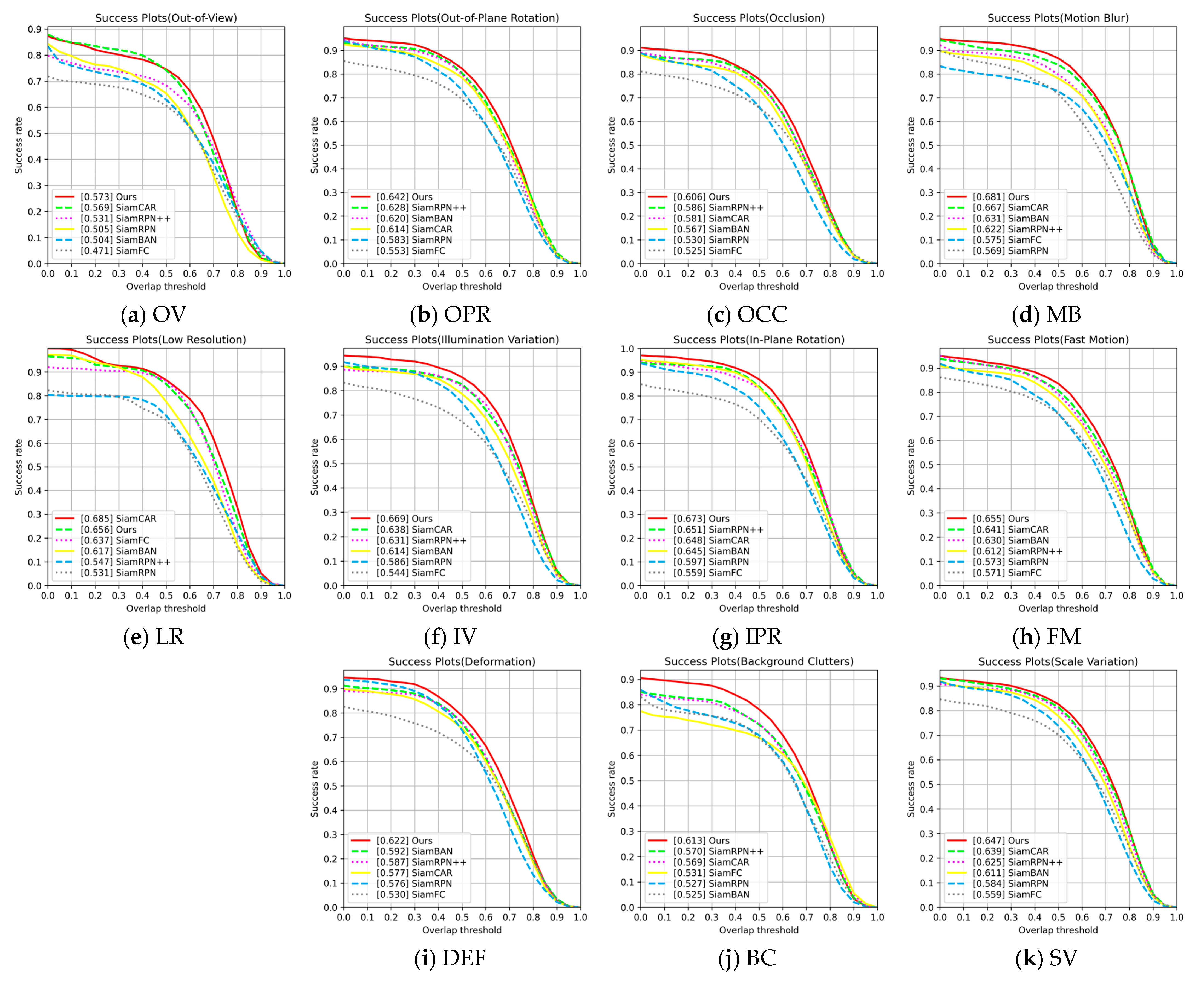 Table 5, our method achieves superior success rates compared to the baseline in the majority of the 11 OTB100 challenge attributes, specifically including OCC, IV, SV, FM, BC, DEF, MB, IPR, OPR and OV. Notably, the gains are most pronounced under deformation and background clutters, where the success rates are 4.5% and 4.4% higher than those of SiamCAR, respectively. This indicates that the proposed method has clear advantages in handling target deformation and interference from complex backgrounds. In addition, it performs strongly in challenging conditions such as motion blur and illumination variation, demonstrating strong environmental adaptability. Furthermore, the relationship between success rate and overlap threshold for different trackers under these 11 challenge attributes is shown in