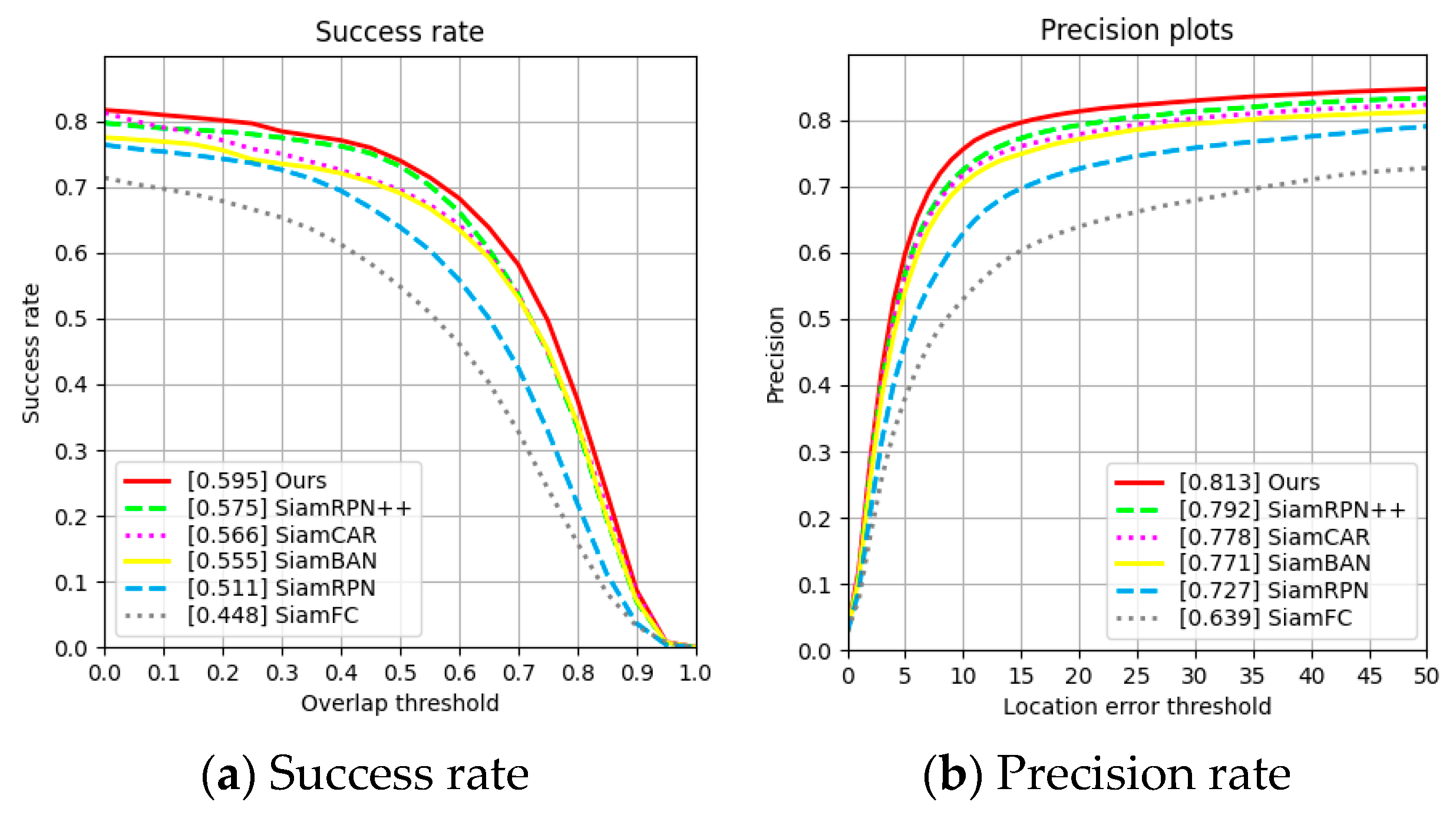 To scientifically evaluate tracking performance, success rate (SR) and precision rate (PR) are used as evaluation metrics [