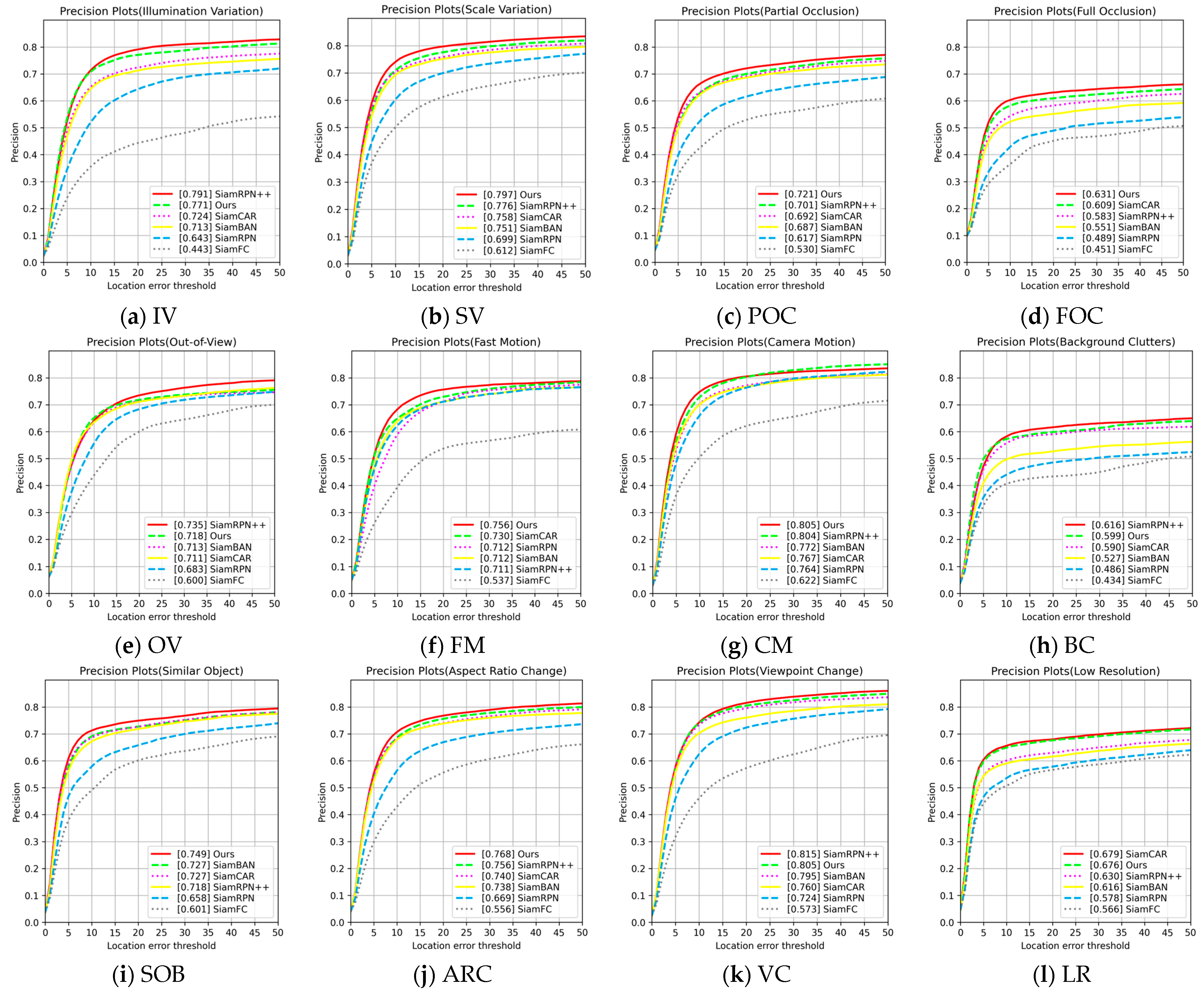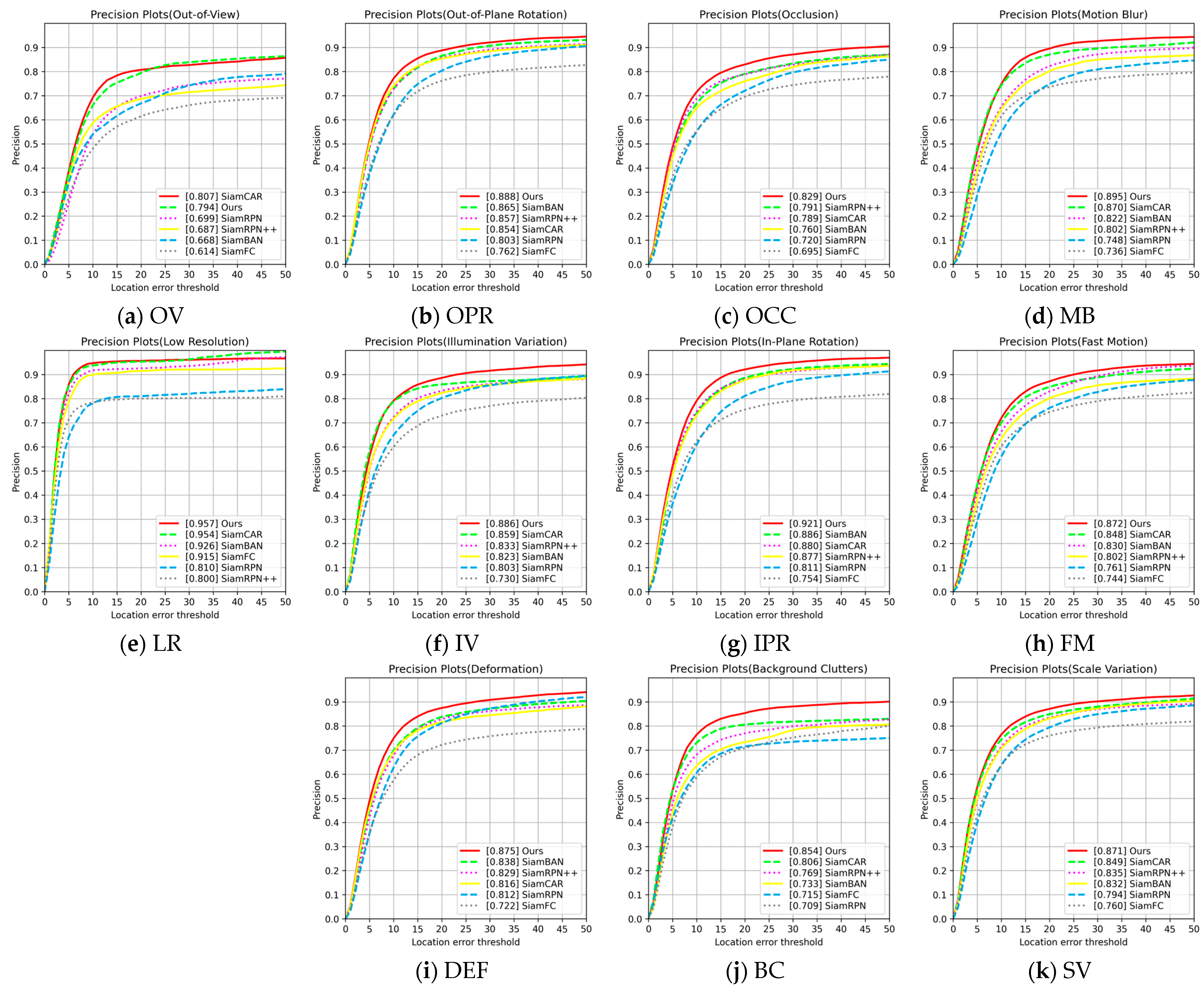 Table 7, the proposed method achieves higher precision under most of the 11 challenge attributes on the OTB100 dataset, including OCC, IV, SV, FM, BC, DEF, MB, IPR, OPR and LR. Notably, the improvements are particularly significant under deformation and background clutters, where the precision is 5.9% and 4.8% higher than that of SiamCAR, respectively. This suggests that our method not only tracks the target reliably, but also localizes the target boundaries more accurately. Furthermore, the relationship between precision and the location error threshold for different trackers under these 11 challenge attributes is illustrated in