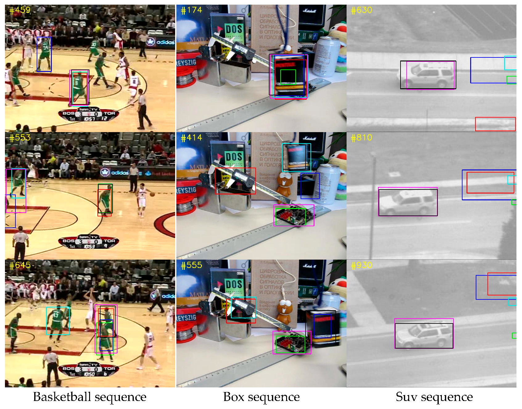 Figure 15, the predicted bounding boxes of different trackers are overlaid on the video frames to enable a direct visual inspection of tracking quality. In
