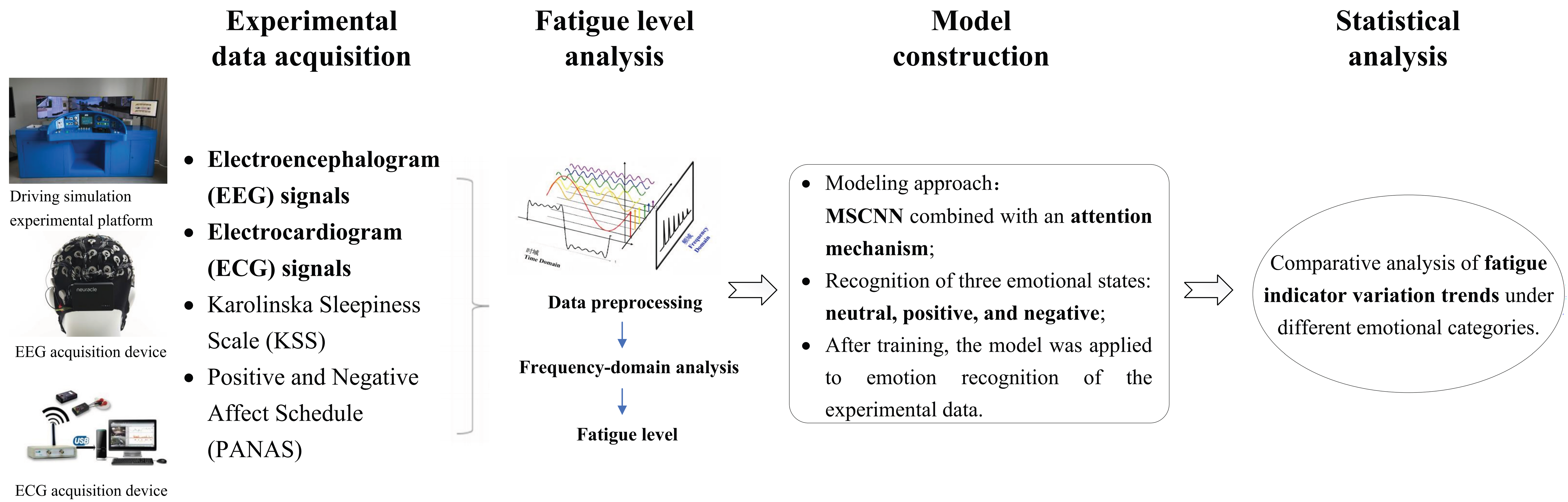 After the training process is completed, the trained model is applied to ECG data collected during metro driving tasks to evaluate its performance in classifying drivers’ emotional states. The data for performing experiments are obtained from a metro driving simulation platform. EEG and ECG signals are synchronously collected from all participants during the experiment. The EEG data are subject to feature extraction for assessing fatigue levels, while the ECG data are used for emotion recognition. The emotion labels predicted by the trained model are temporally aligned with fatigue indicators derived from EEG signals over the same time segments, and statistical analyses are conducted to quantify the effects of different emotional states on fatigue levels. By comparatively analyzing the variation trends of fatigue indicators under different emotional categories, dynamic regulatory characteristics of emotions on the formation and evolution of driver fatigue are extracted, thereby obtaining analytical data on the roles of positive, neutral, and negative emotions during fatigue accumulation and regulation phases. These analytical results not only help in quantifying the magnitude and direction of the effects of emotions on driving fatigue, but also provide data support and theoretical foundations for real-time emotion monitoring and fatigue intervention strategies for urban rail transit drivers. The overall workflow of the proposed method is illustrated in