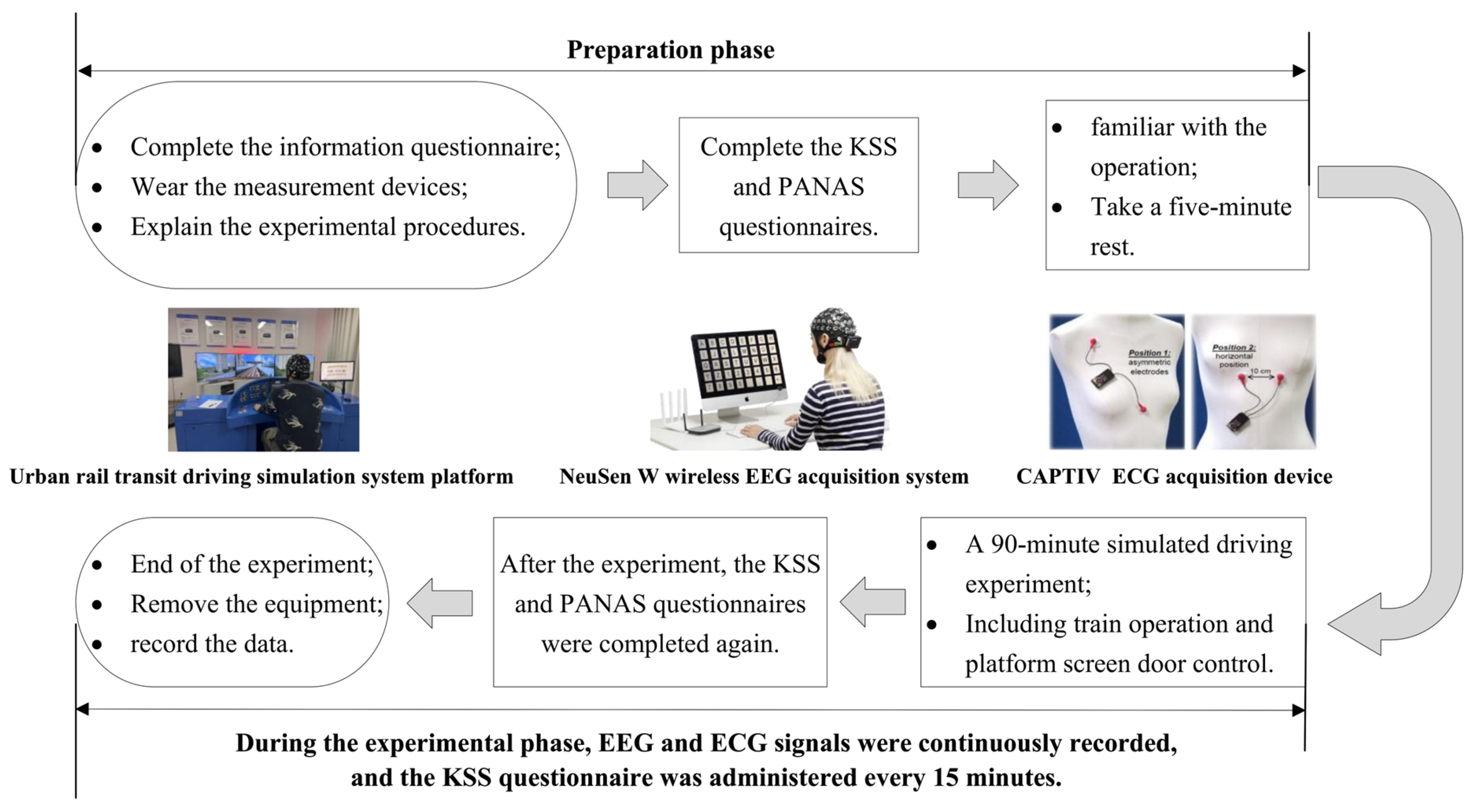 Figure 2. This study employs an urban rail transit driving simulation system for conducting experiments by simulating metro driving to reproduce real-world operating conditions. Shanghai Metro Line 3 is used to achieve a high-fidelity representation of the actual driving environment. EEG signals are measured using the NeuSen W-series wireless EEG acquisition system. This system ensures high-quality multimodal physiological signal collection during simulated driving tasks. In addition, an ECG acquisition device from the CAPTIV series is used to collect the data of the participants. The data recording and analysis are performed using the CAPTIV-L7000 multimodal physiological and behavioral data acquisition and analysis system.