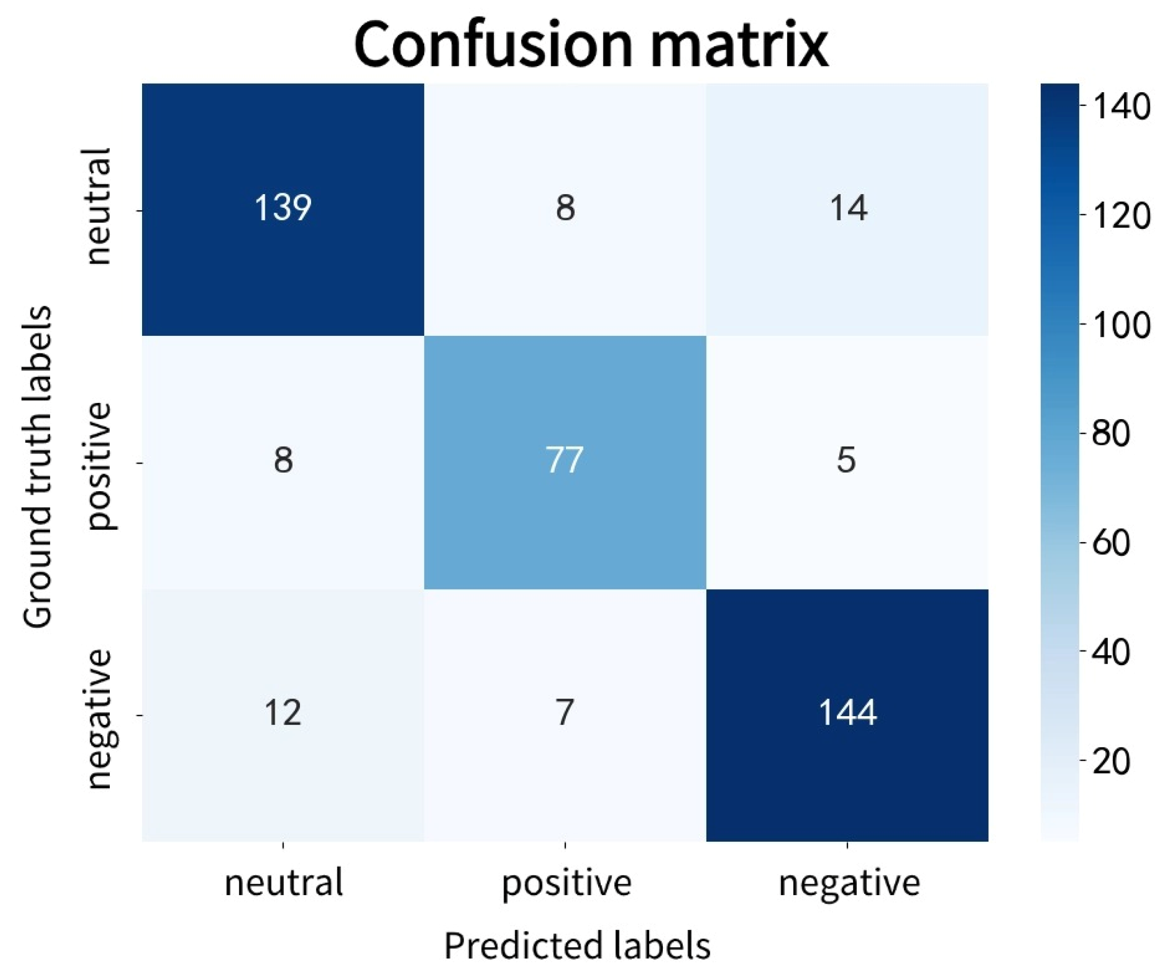 Figure 5, the confusion matrix results show that the proposed model overall exhibits a stable performance in recognizing the three emotion categories, with the highest accuracy observed for “neutral” and “negative” emotions, i.e., 139 (the number of neutral emotion samples is 161, and the proportion of successfully recognized samples is 86.34%) and 144 (the number of negative emotion samples is 163, and the proportion of successfully recognized samples is 88.34%) samples were correctly classified, respectively. For the “positive” emotion, the model was able to correctly identify most of the samples, although some “positive” samples were misclassified as “neutral” or “negative”. This indicates that the proposed model is sensitive to subtle differences between neutral and adjacent emotional states. Overall, the concentration of values along the diagonal of the confusion matrix suggests that the model effectively distinguishes among different emotion categories, demonstrating a good classification reliability.