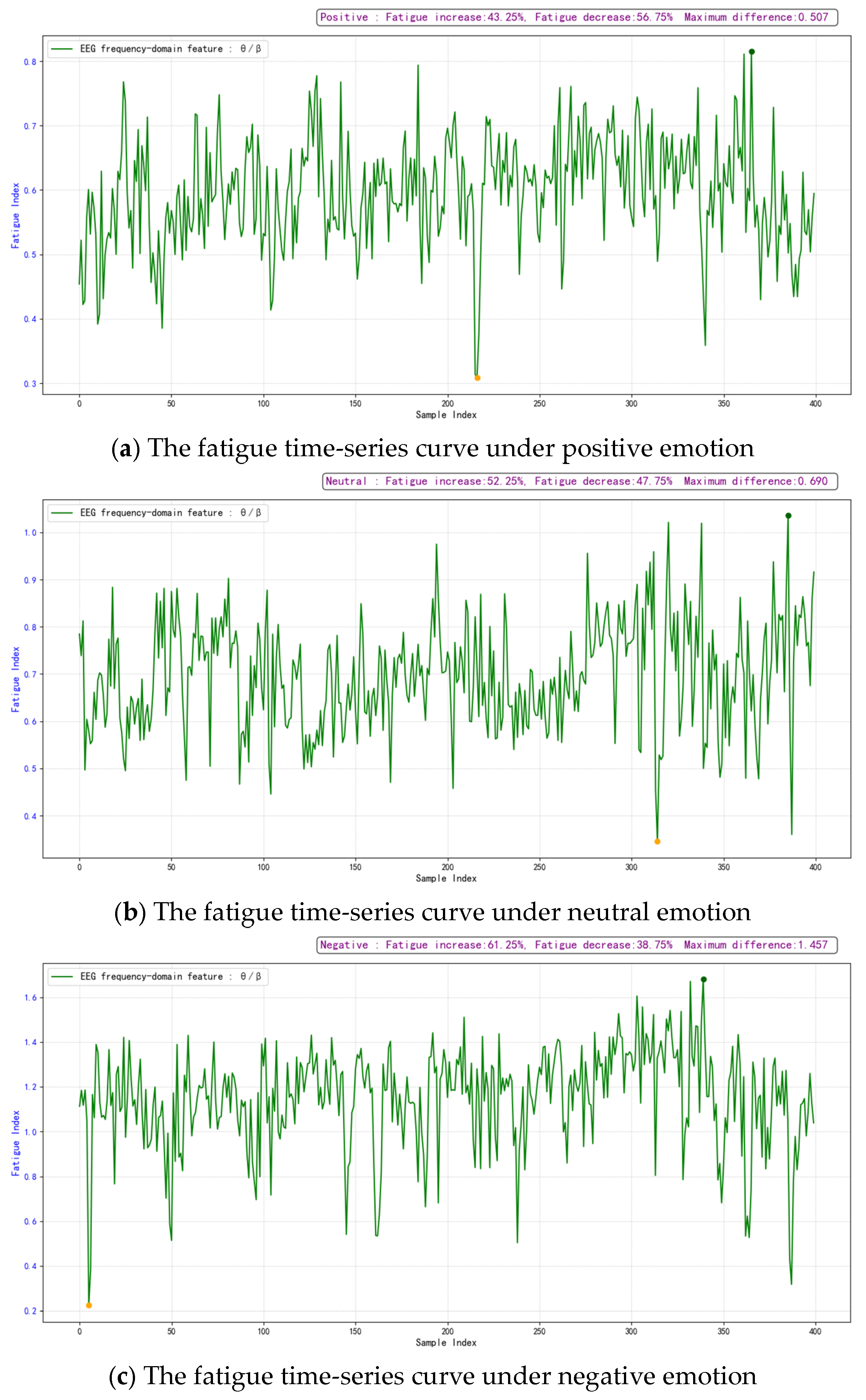 Figure 7 illustrates the temporal variations in fatigue under three emotional states for a representative participant during the experiment, where (a) shows the fatigue time-series curve under positive emotion, (b) shows the fatigue time-series curve under neutral emotion, and (c) shows the fatigue time-series curve under negative emotion.
