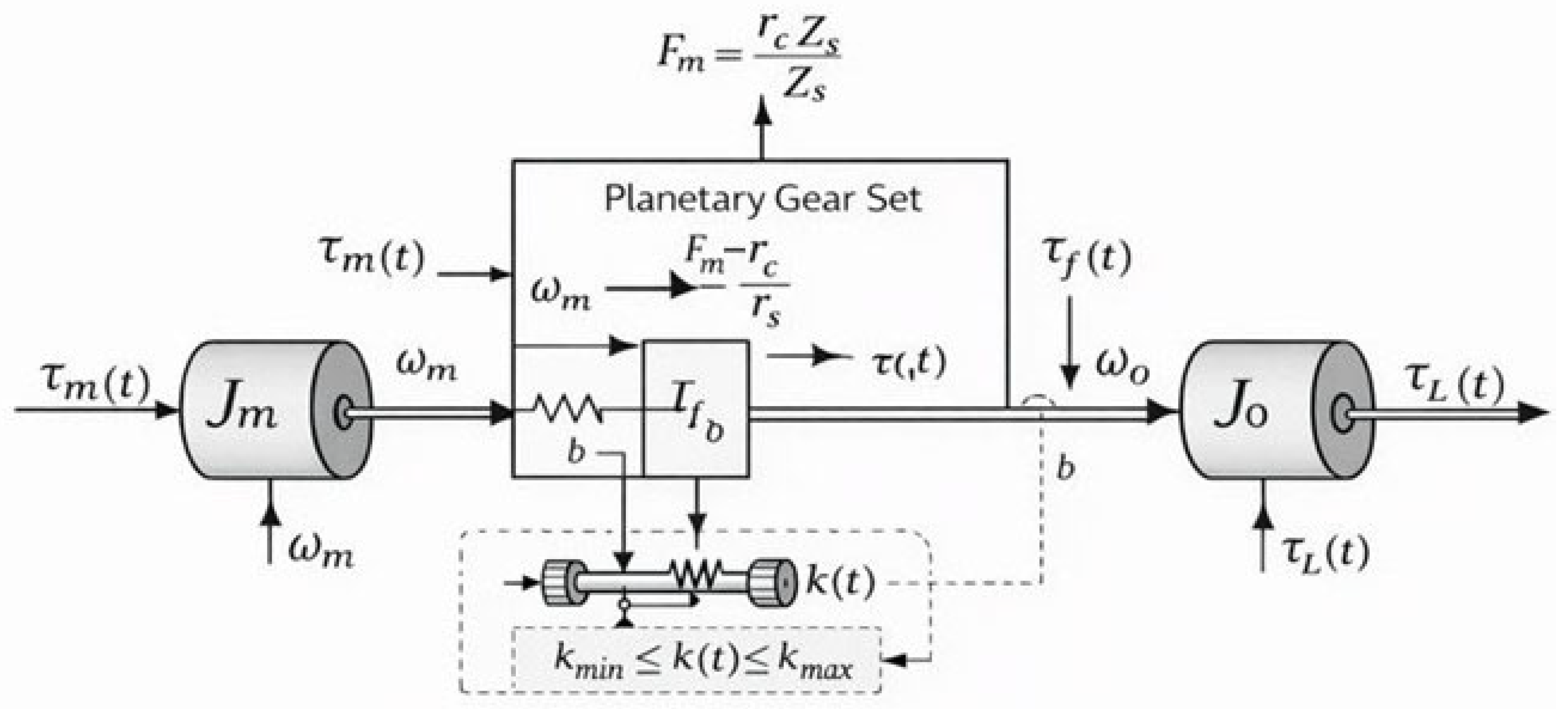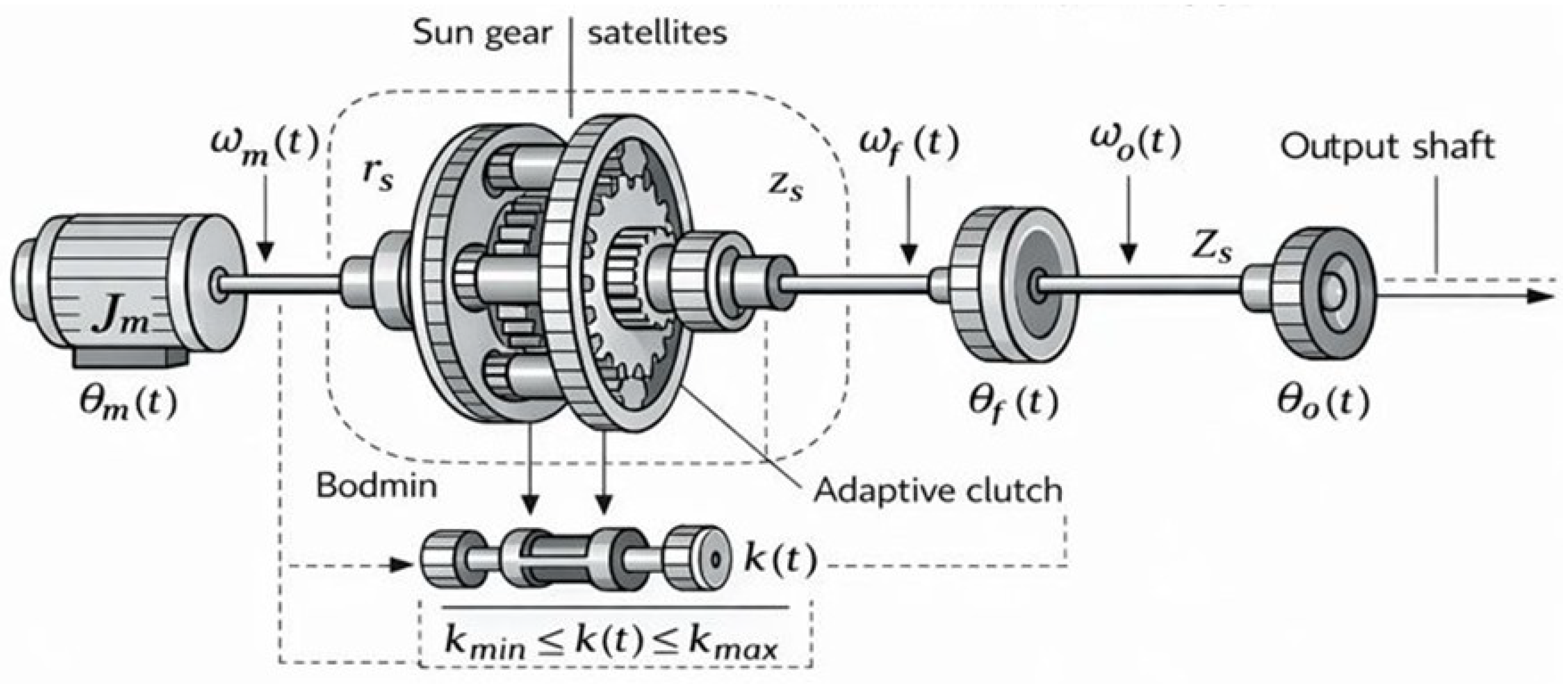 19]. In such systems, dynamic properties are fully determined by the motor characteristics and the control algorithm, while the mechanical part does not have the capability to adapt to changing operating conditions. In the presence of variable loads, slip, sharp transient processes, or external disturbances, this leads to an increase in peak torques, a decrease in stability, and the necessity to use high-gain controllers. Thus, there arises a need to develop a mechanically adaptive drive in which the formation of the dynamic response is achieved not only by control means but also through purposeful modification of the kinematic structure. In this work, an adaptive electromechanical drive based on a planetary transmission with a controlled internal inertial coupling is proposed. In contrast to traditional drives, the mechanical structure of the system is intentionally formed as a multi-mass system, which makes it possible to implement controlled redistribution of angular momentum within the drive. The key feature of the proposed solution is the introduction of an internal inertial flywheel connected to the output shaft through a controlled kinematic unit. As a result, the mechanical part of the drive acquires an additional degree of freedom, and the kinematic relationships between the system elements become controllable. The kinematic architecture of the proposed drive is shown in