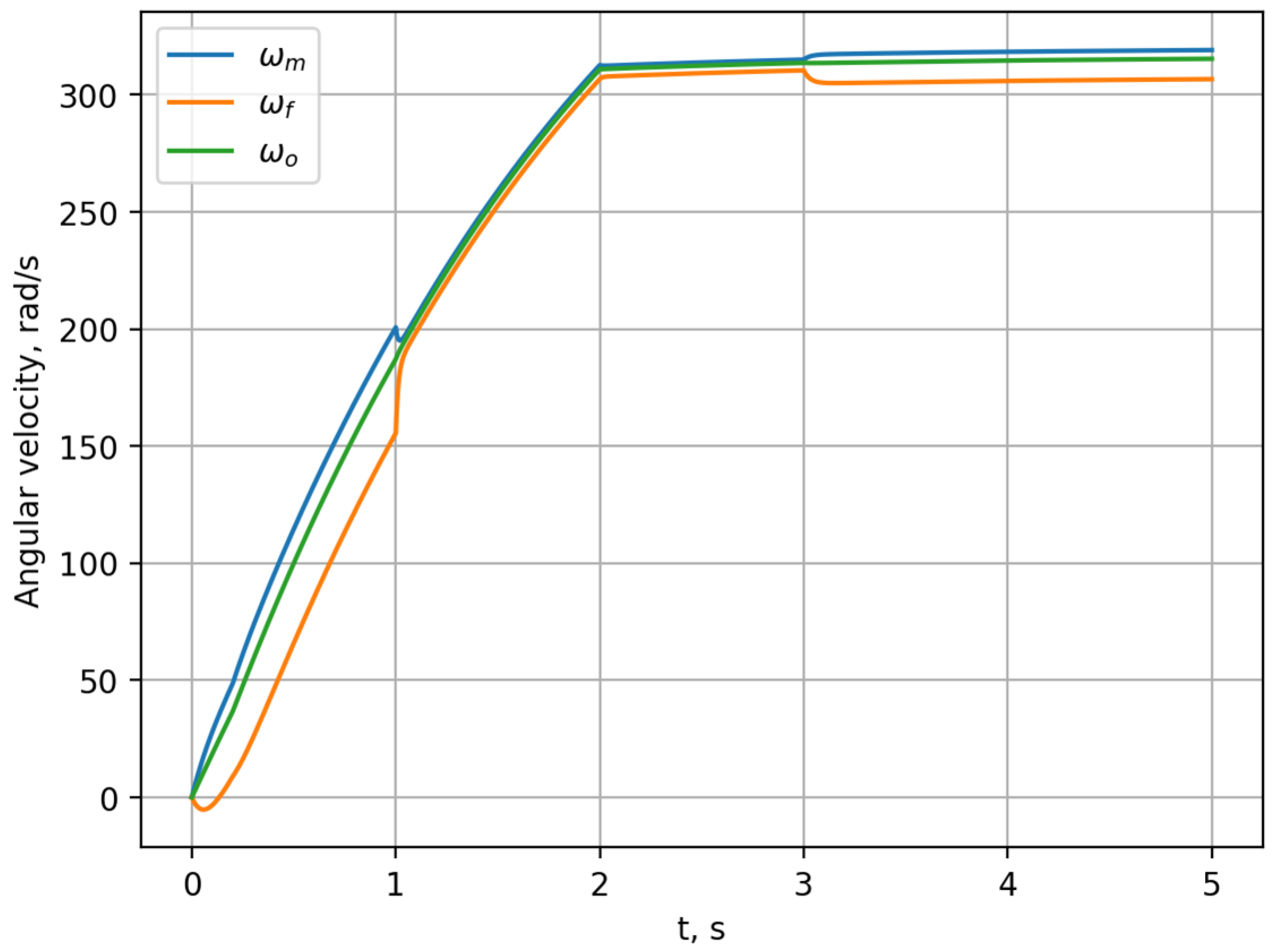 The physical meaning of the proposed control strategy is the adaptive formation of the internal energy exchange loop based on the current dynamic state of the system. For small tracking errors, the intensity of the internal coupling between the flywheel and the output link decreases, which leads to a reduction in energy losses and an increase in the overall efficiency of the drive. When sharp speed changes or stepwise load disturbances occur, the coupling coefficient automatically increases, ensuring active involvement of the internal flywheel in compensating external effects and redistributing kinetic energy within the system. As a result, transient damping is performed primarily at the mechanical level through the controlled drive structure, rather than exclusively by increasing the electromagnetic motor torque, which contributes to reducing peak loads and improving dynamic stability.