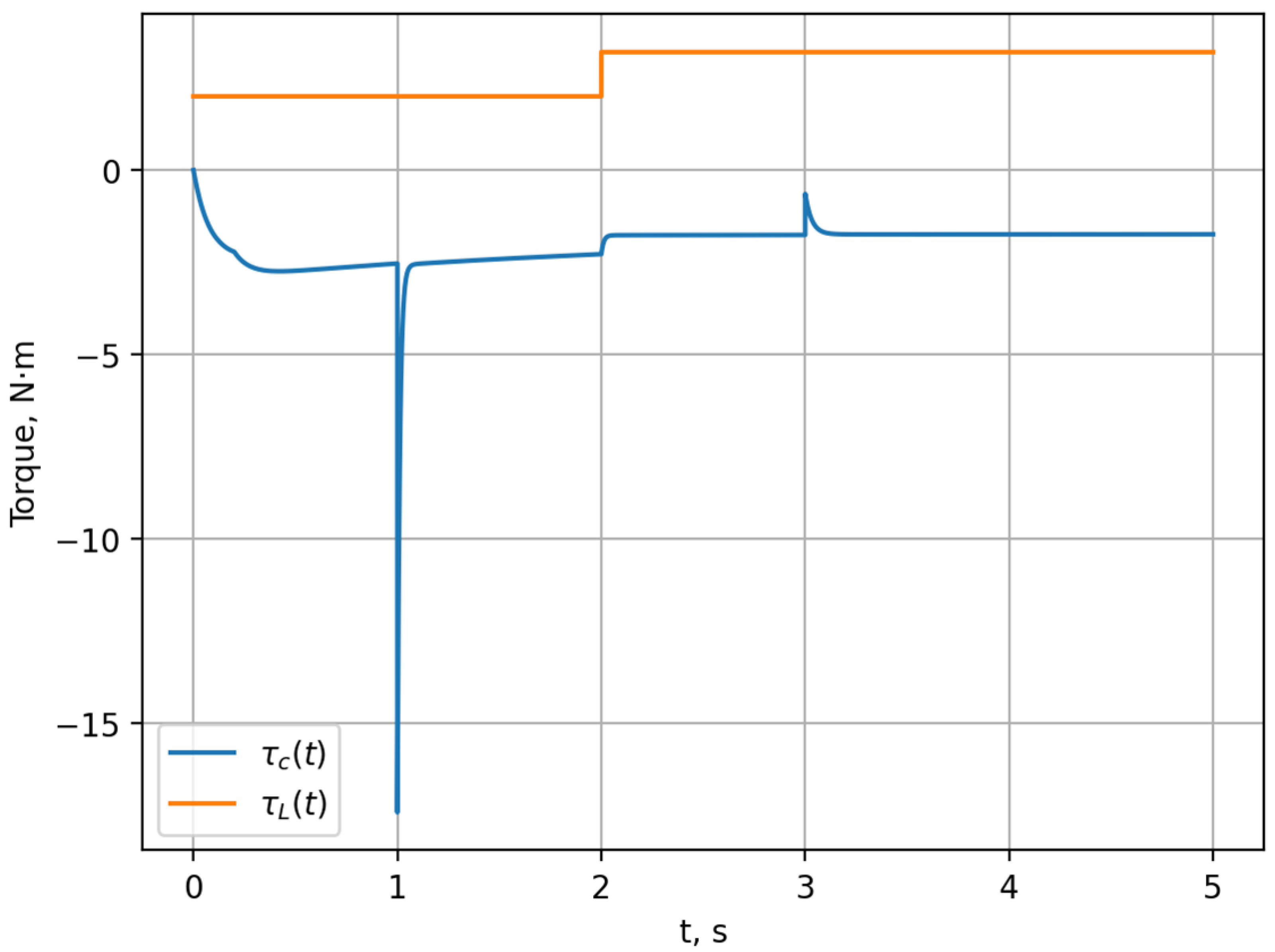 Experiment 6 is aimed at investigating the limiting operating regimes of the drive under extreme load disturbances and verifying the physical feasibility of the system, taking into account motor torque constraints. Unlike previous experiments, the main emphasis here is not on tracking quality but on the system’s ability to maintain operability without violating the actuator’s physical constraints. A transient regime with a sharply increasing load torque