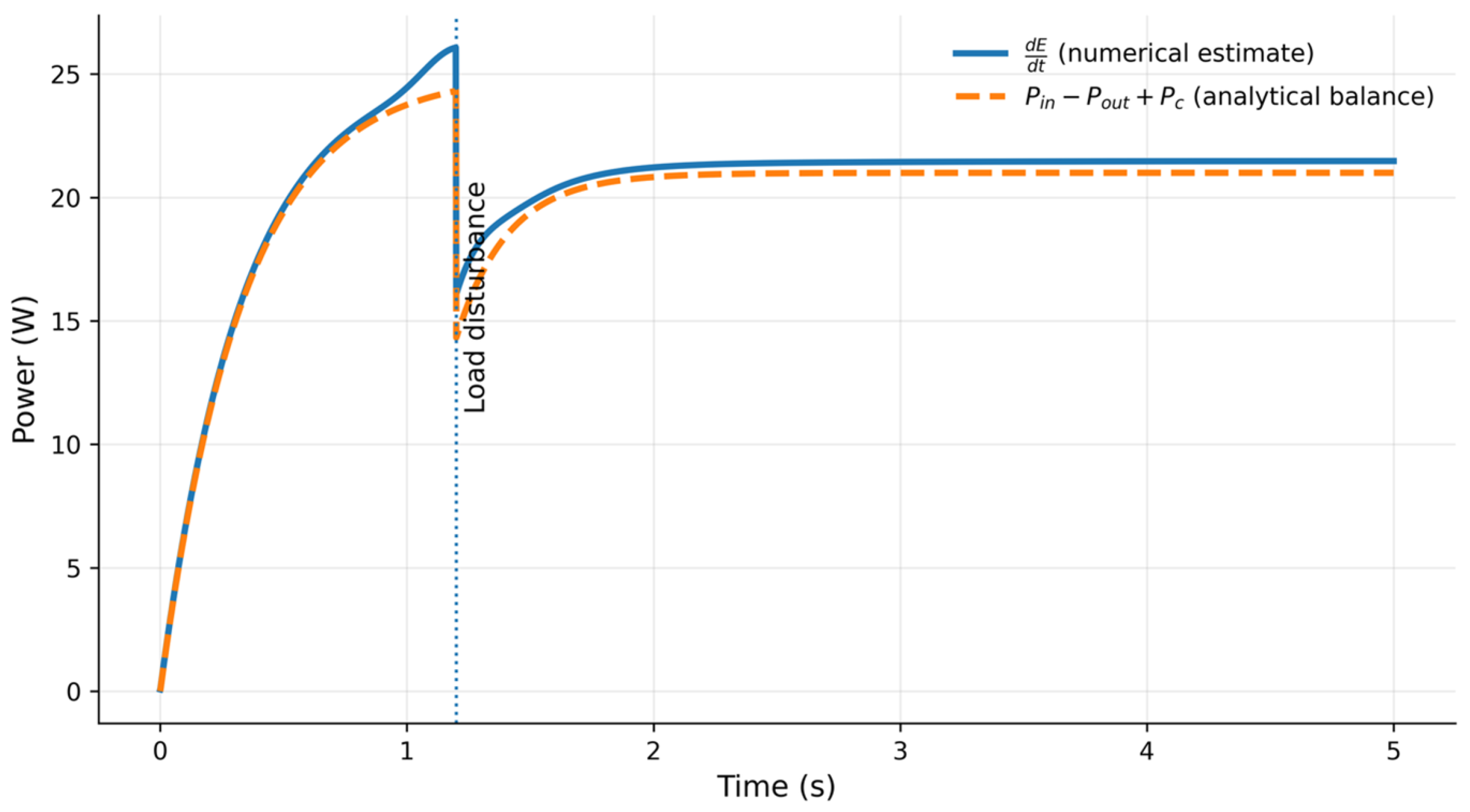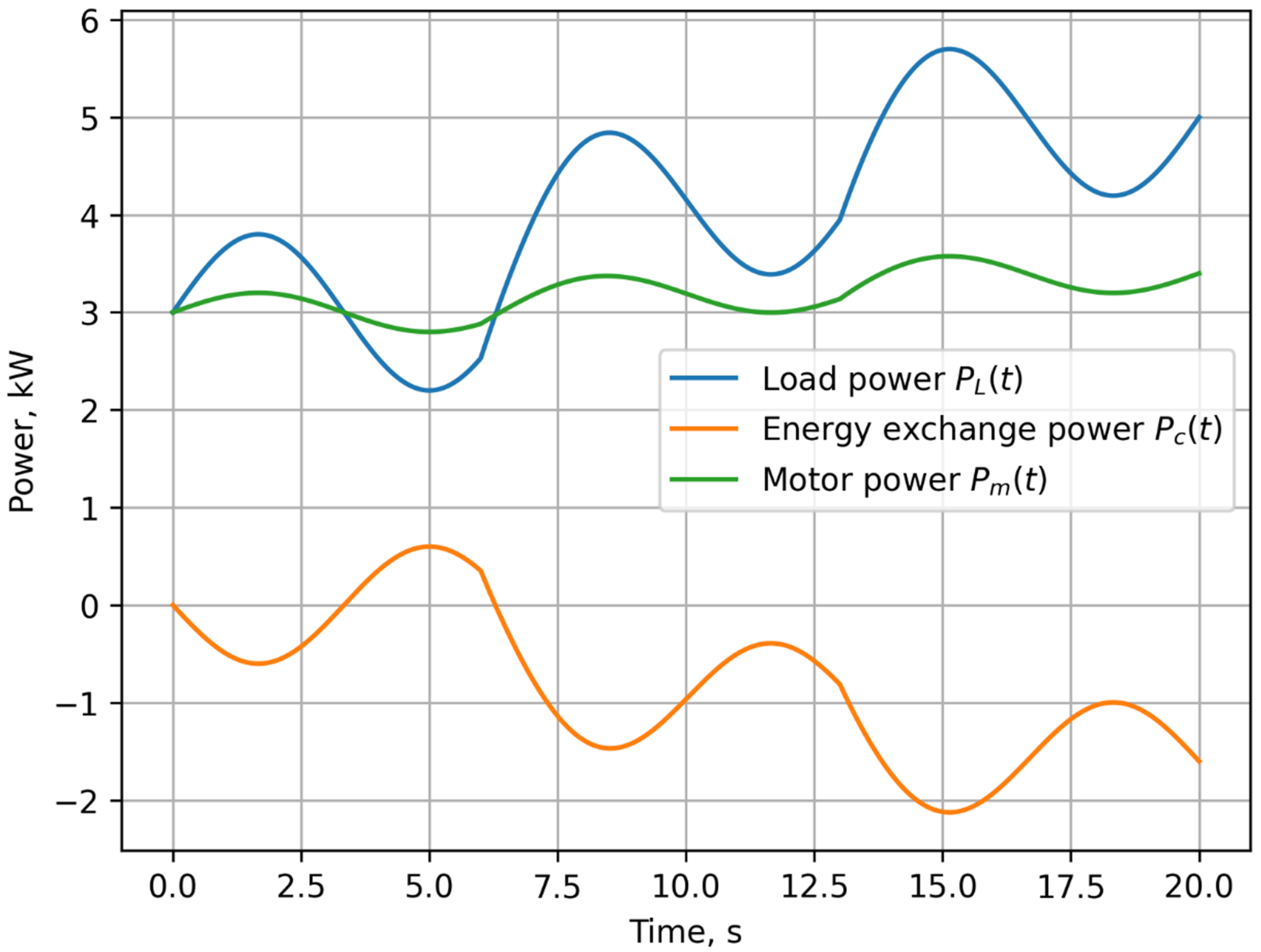 Experiment 4 is aimed at analyzing internal energy redistribution in the proposed electromechanical drive and providing a quantitative explanation of the mechanism for reducing peak energy loads on the motor. Unlike the previous experiments, the focus here is not on the output dynamics, but on the power balance between the load, the motor, and the internal energy-exchange loop. The instantaneous load power is defined as