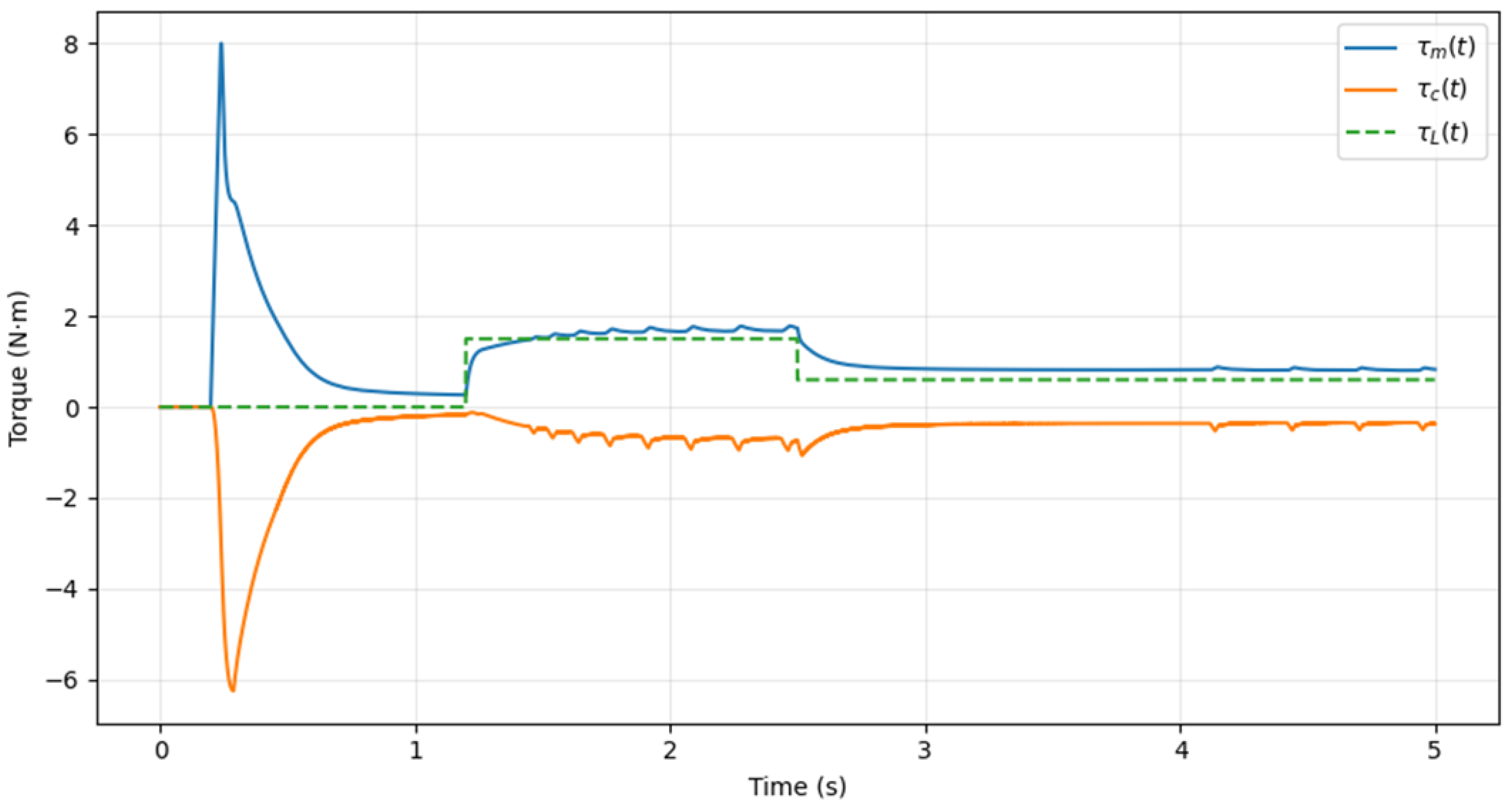 Figure 17 represents a practically meaningful validation scenario. In compact robotic platforms, transport drive units, and industrial servo systems, actuator selection is typically determined by short-duration peak torque demands rather than steady-state values, often resulting in 25–50% torque oversizing margins to ensure reliable operation under transient disturbances. The demonstrated elimination of torque saturation and reduction of peak motor torque in the proposed architecture therefore indicate practically significant benefits, including potential reduction of actuator mass and cost, improved energy utilization, and expansion of the feasible operating envelope without increasing nominal motor capacity.