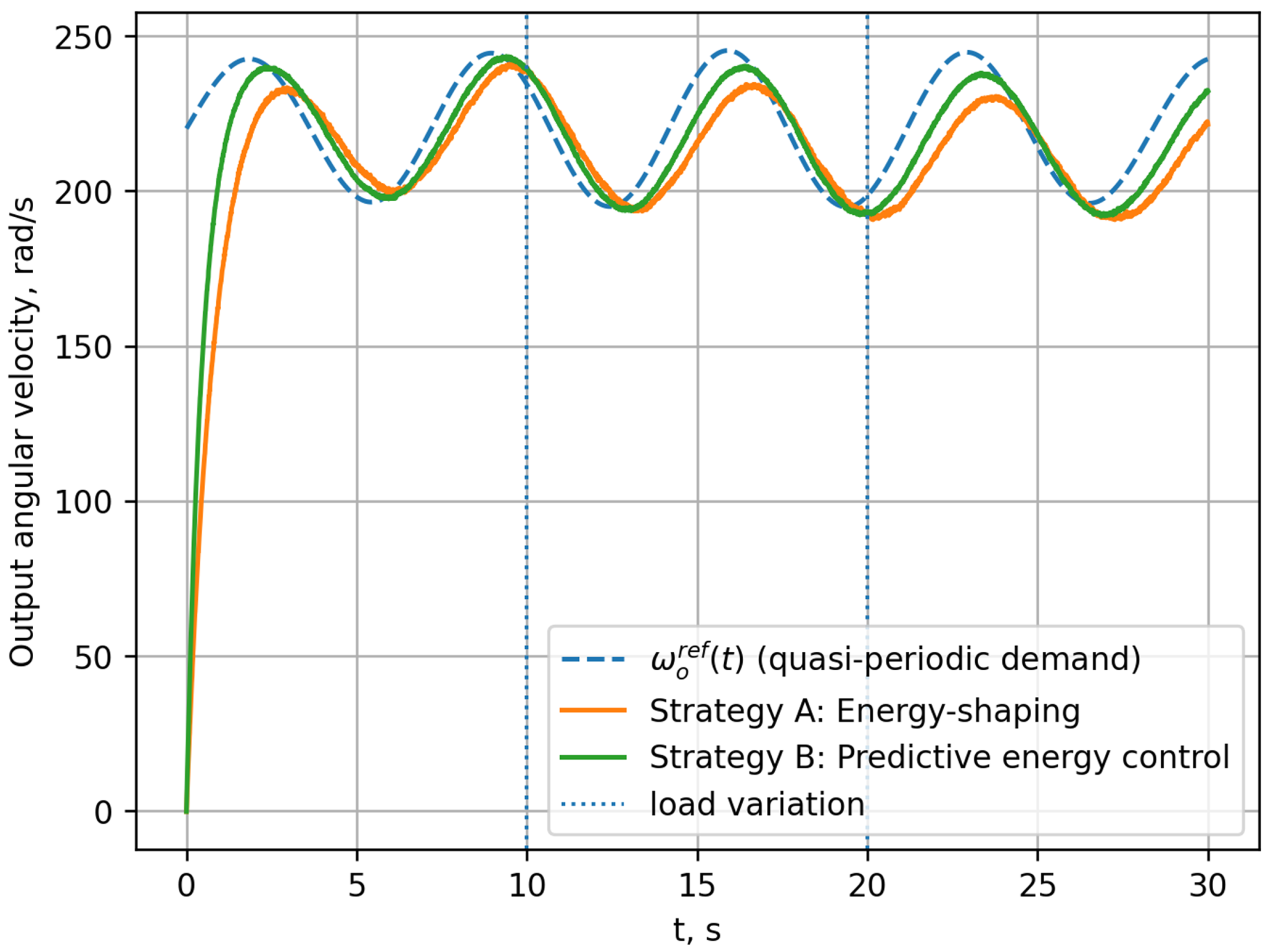 Figure 9 presents the simulation results of the output link dynamics when applying the energy-oriented control strategy. The system maintains stability during transient regimes and disturbances, with damping primarily driven by internal energy exchange rather than by increased motor torque.