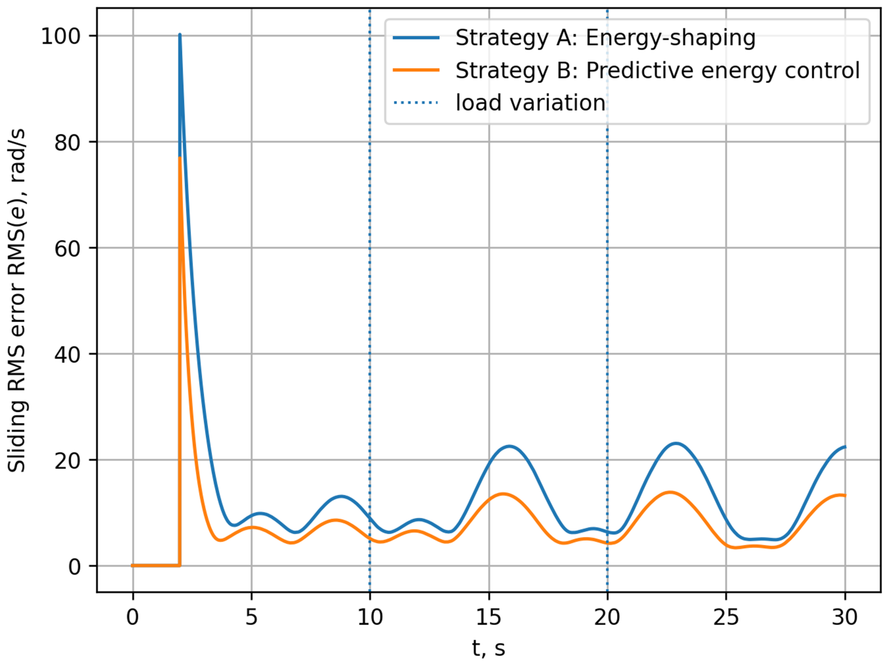 When using adaptive energy-based control (Strategy A), a noticeable mismatch between the reference and the output speed is observed, especially during intervals of signal amplitude and frequency variation. The presence of load variations leads to the accumulation of phase shift and an increase in deviation amplitude, which indicates the limited ability of the reactive strategy to compensate for slowly varying operating conditions. In the case of adaptive predictive energy-based control (Strategy B), the output speed follows the reference profile more accurately over the entire simulation interval. Reduced phase shift and lower sensitivity to load changes indicate that anticipatory redistribution of energy between the motor and the internal flywheel makes it possible to maintain stable tracking even under a quasi-periodic reference profile. It should be noted separately that the difference between the strategies manifests itself not in sharp transients but in the quality of steady-state tracking, which makes this experiment particularly indicative of the practical effectiveness of the proposed approach.