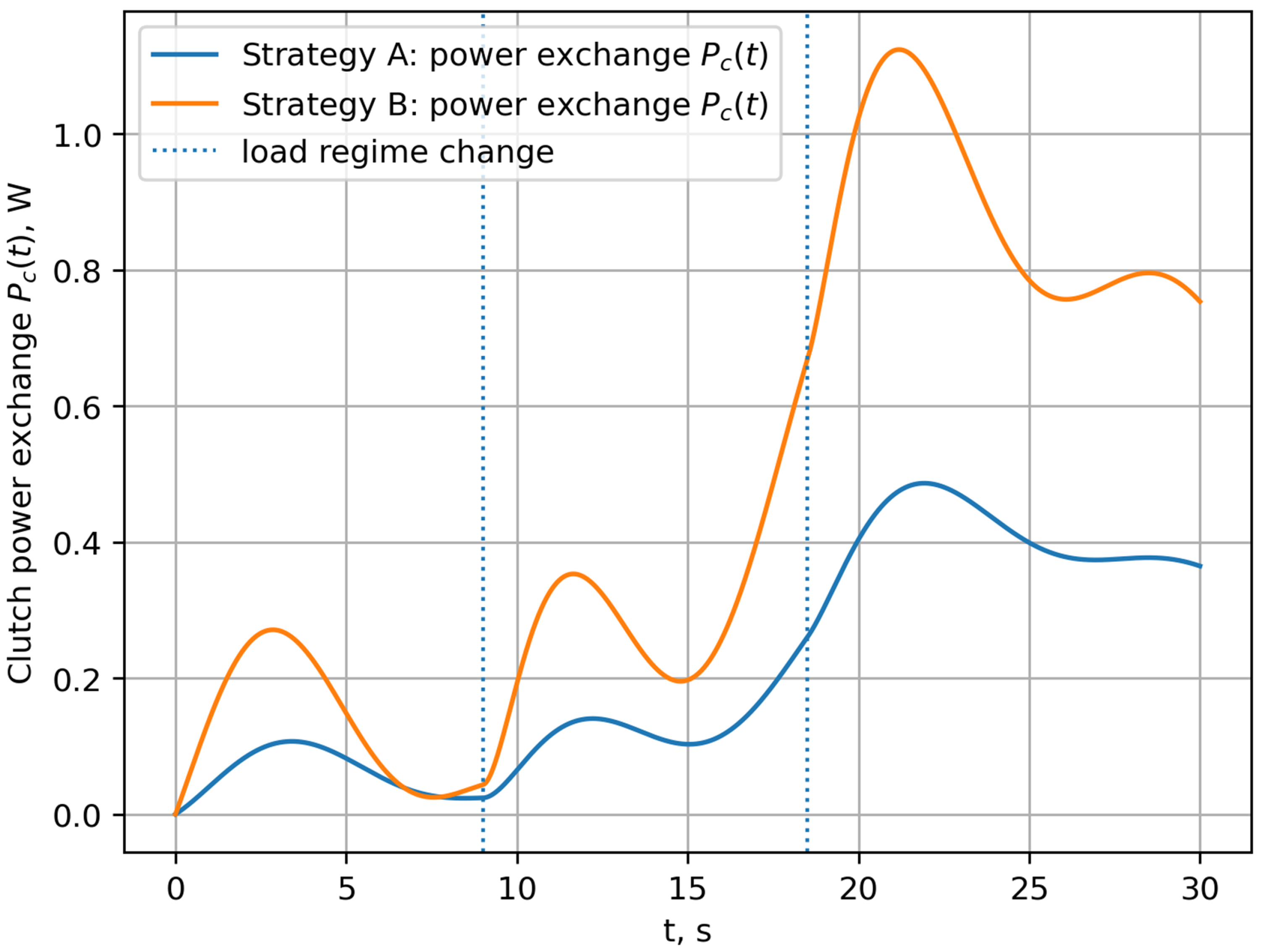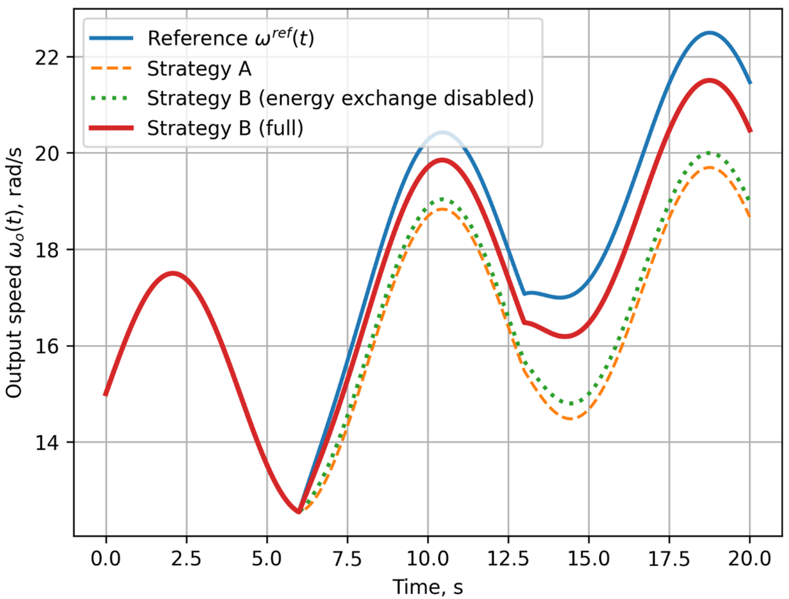 When using the baseline control strategy (Strategy A), noticeable deviations from the reference trajectory are observed at moments of regime change, which is associated with the need to compensate for disturbances exclusively by the motor. For Strategy B with the energy exchange loop disabled, the system dynamics practically coincide with the baseline case, which indicates the limited effectiveness of algorithmic control complexity alone.