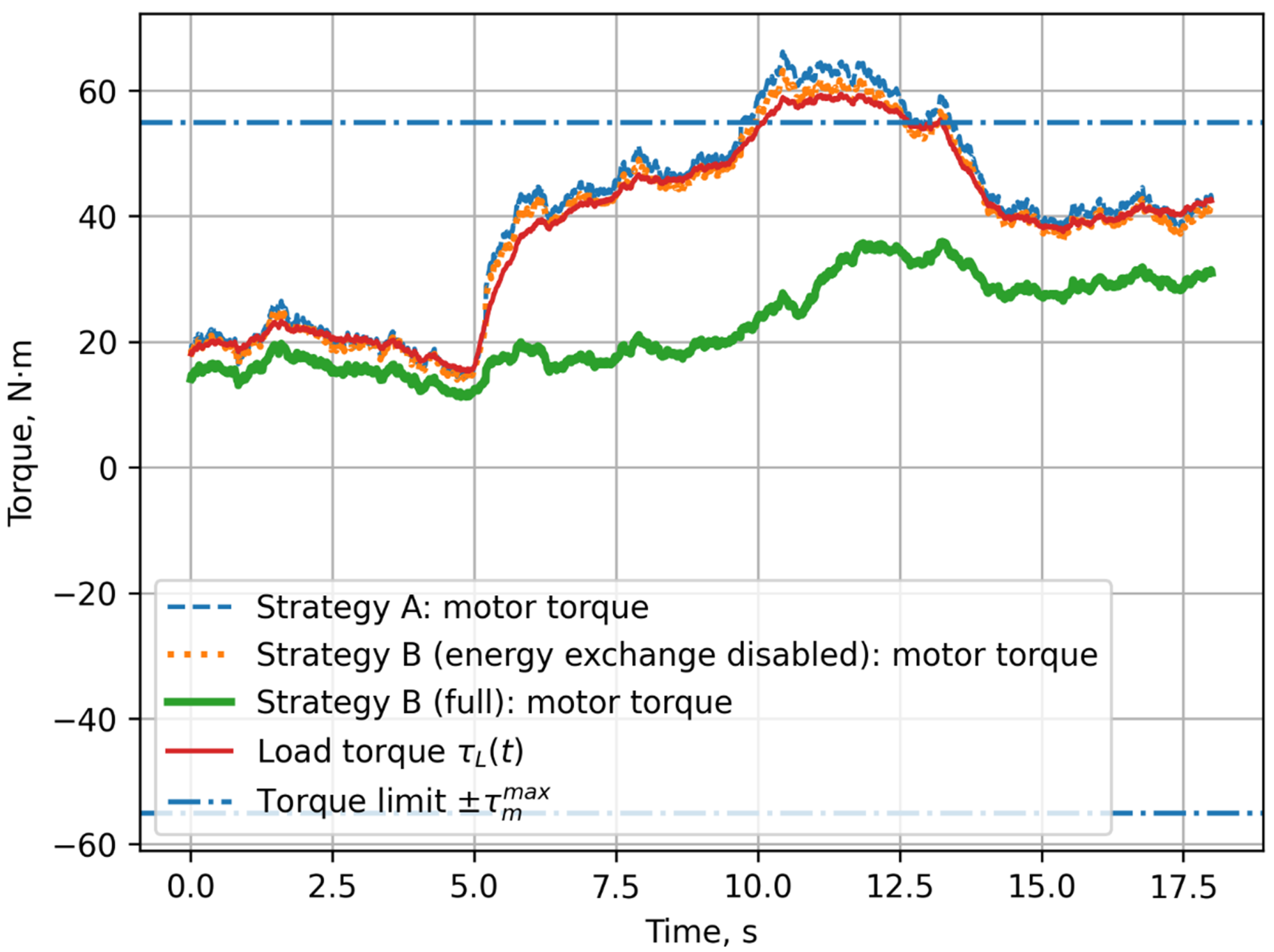 In the baseline case (Strategy A), a sharp increase in the load leads to exceeding the allowable motor torque, which indicates infeasibility of the operating regime under the given physical constraints. Similar behavior is also observed in the ablation case of Strategy B (energy exchange disabled), despite preserving the control structure. In contrast, when using the full version of Strategy B, the motor torque remains within the allowable limits over the entire simulation interval. This is achieved through a temporary redistribution of load via the energy exchange loop, which reduces the motor’s instantaneous load at critical moments.