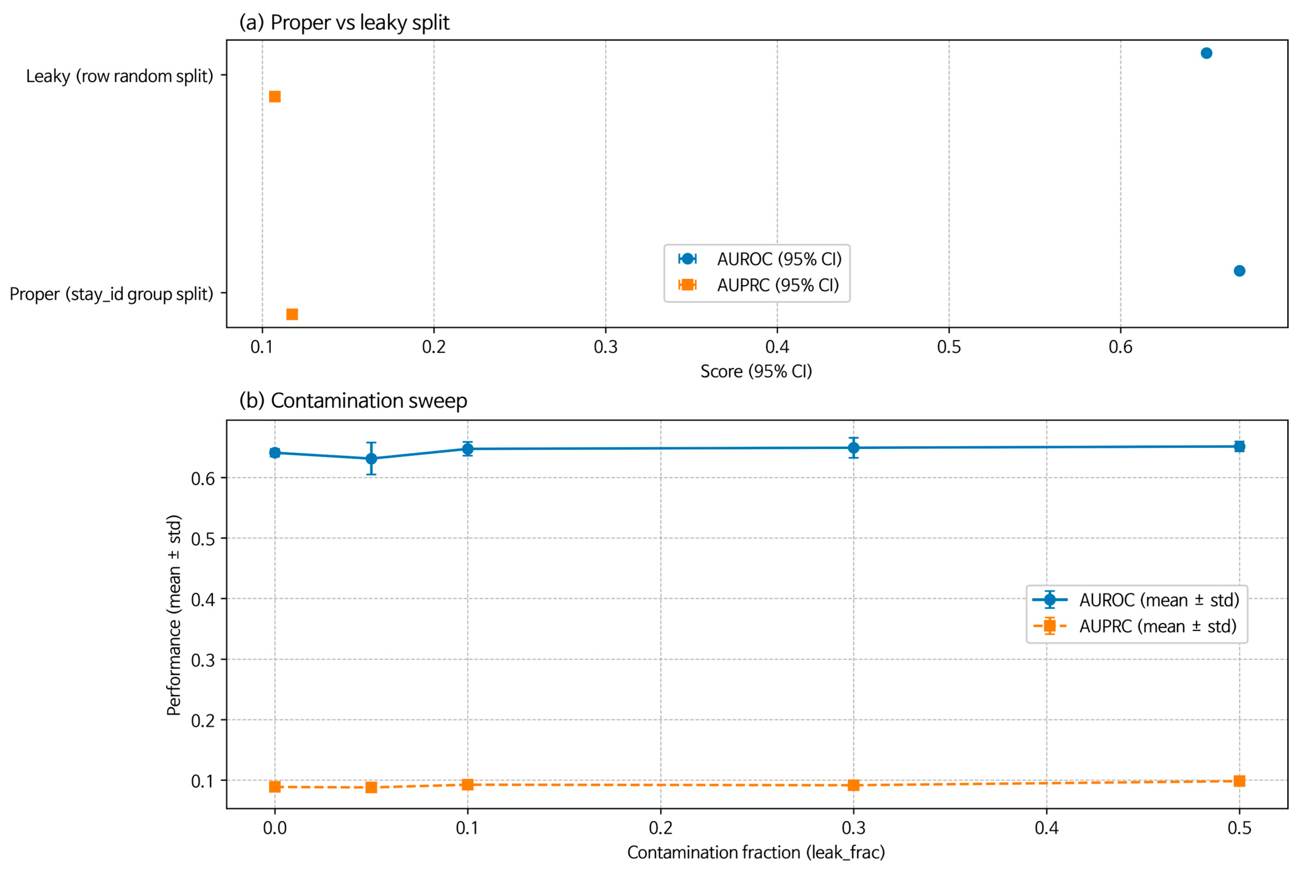 - Supplementary trustworthiness analyses, including leakage stress tests (proper-vs-leaky splitting and contamination sweeps), calibration/decision-curve analysis, and privacy/security stress tests (membership inference, DP-inspired clipping/noise, and model poisoning).