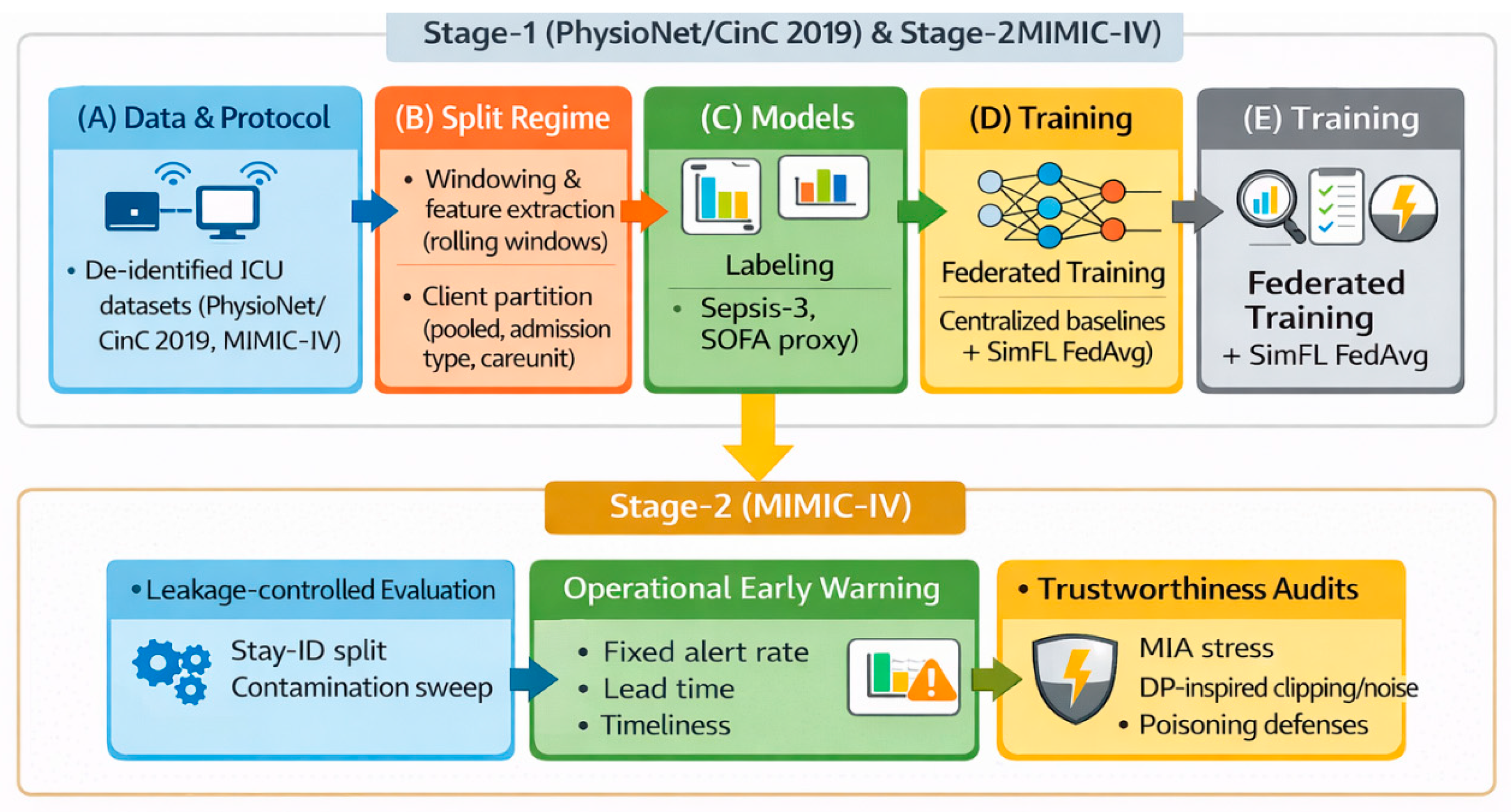 - A two-stage, leakage-aware evaluation framework for sepsis early warning that (Stage-1) benchmarks cross-hospital generalization on PhysioNet/CinC 2019 via a bidirectional cross-hospital evaluation scheme based on the official training sets A and B (A→B/B→A) and (Stage-2) evaluates a Sepsis-3-aligned task derived from MIMIC-IV with simulated federated clients.
