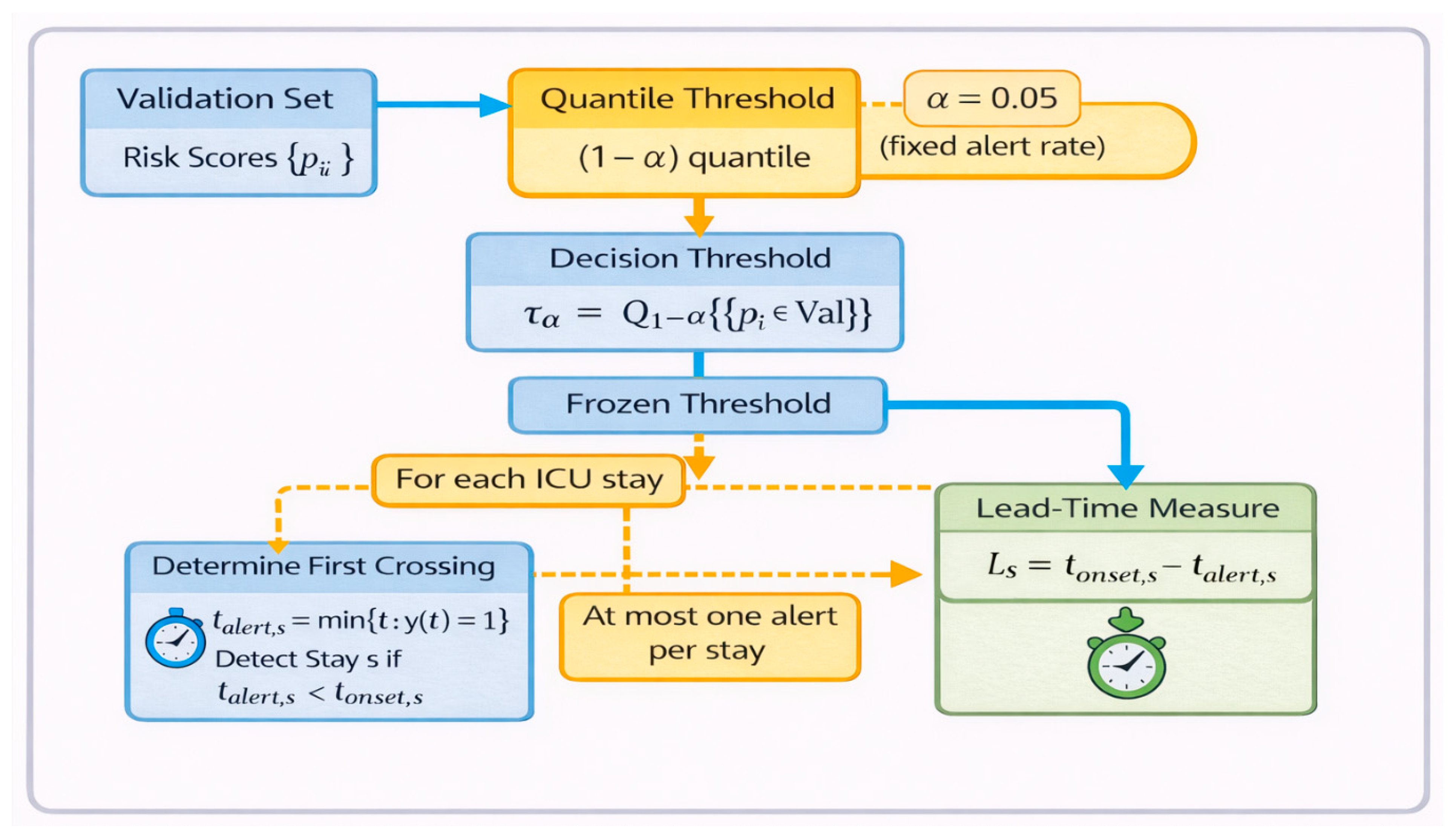 - A workload-matched operational evaluation strategy using fixed alert-rate thresholding (α = 5%) with stay-level detection rates and lead-time distributions to improve clinical interpretability beyond AUROC/AUPRC.