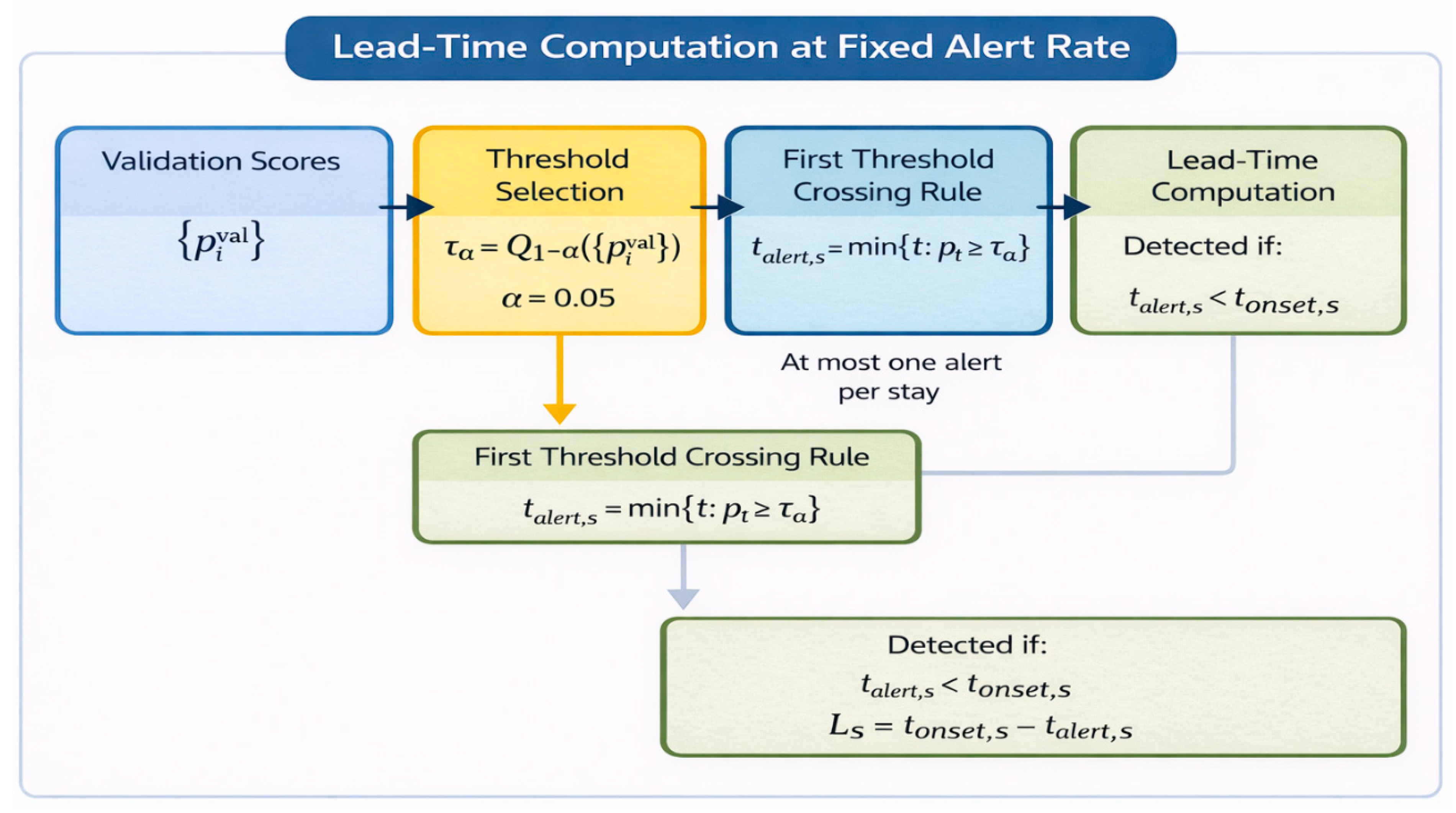 | Input: validation monitored scores ; target alert rate ; test scores ; sepsis onset times . 1. Select . 2. For each sepsis-positive stay define ; if no alert exists, mark the stay as undetected. 3. Detection indicator: . 4. Lead time (defined only if detected): . 5. Report detection rate and the distribution of (median, IQR). 6. Capped timeliness over detected stays: . |