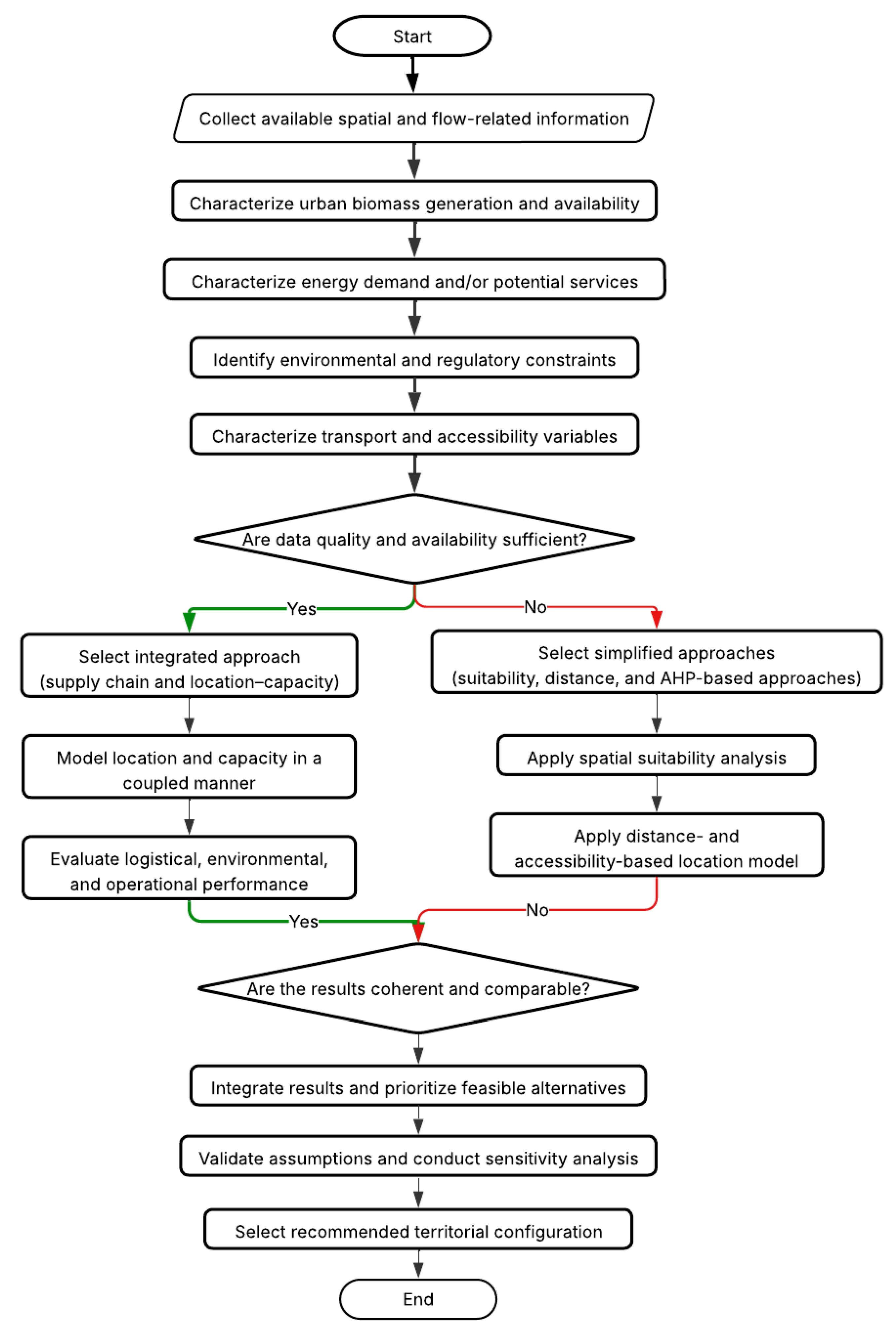 The methodological process is structured as a sequential, feedback-driven flow, in which spatial data are progressively transformed into decision inputs. After the collection and preprocessing of information in a common spatial reference system, key indicators related to biomass supply, weighted demand, accessibility, and environmental constraints are calculated. These indicators allow the generation of analysis zones and candidate alternatives, incorporating iterative adjustments when minimum eligibility criteria are not met.
