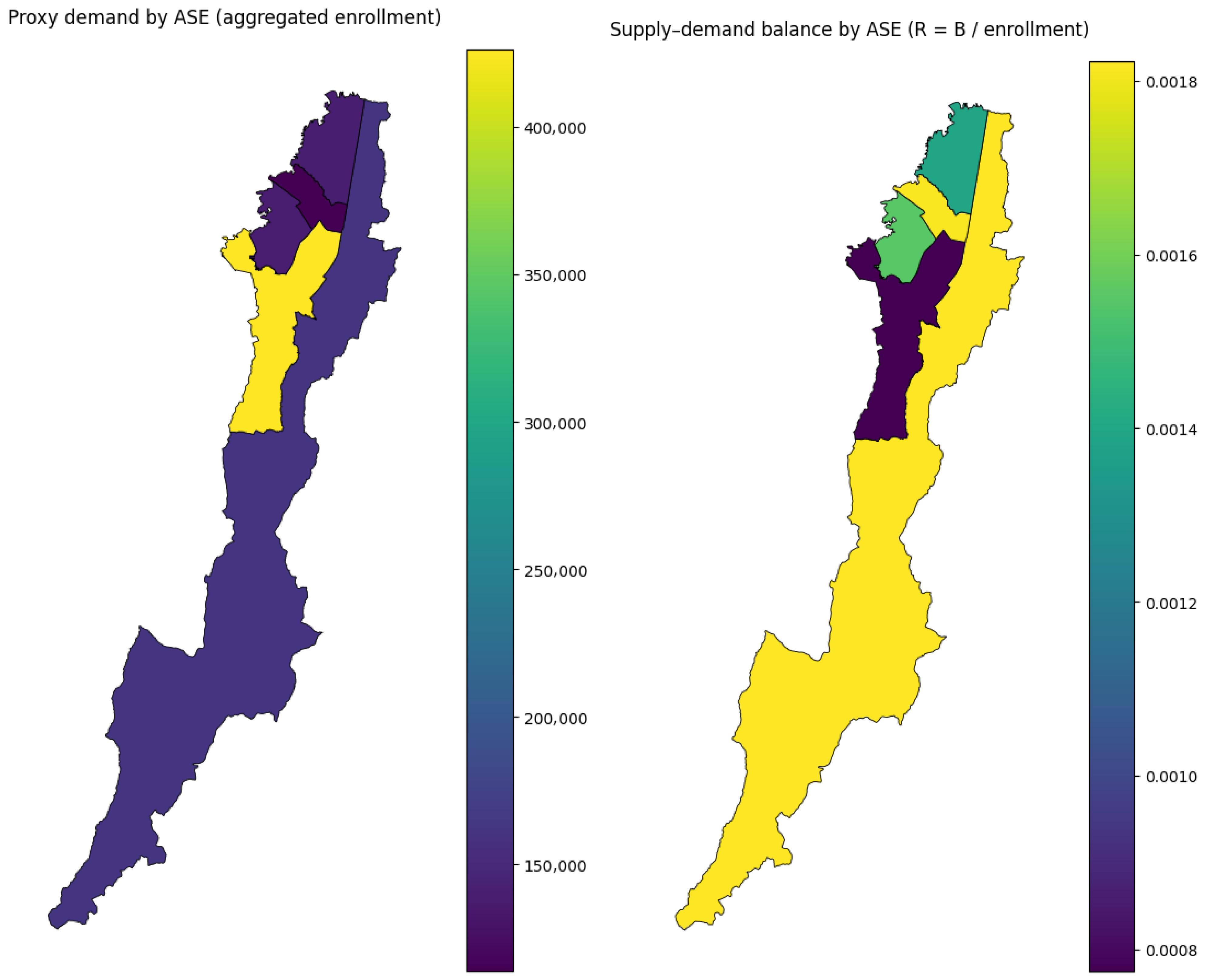 It should be emphasized that D does not represent a direct energy demand, but rather a territorial proxy constructed from district schools with positive enrollment spatially assigned to each ASE. Consequently, the values of R should be interpreted as comparative indicators of territorial balance between proxy supply and demand, dependent on the adopted analytical framework and not as absolute metrics of energy sufficiency or deficit.