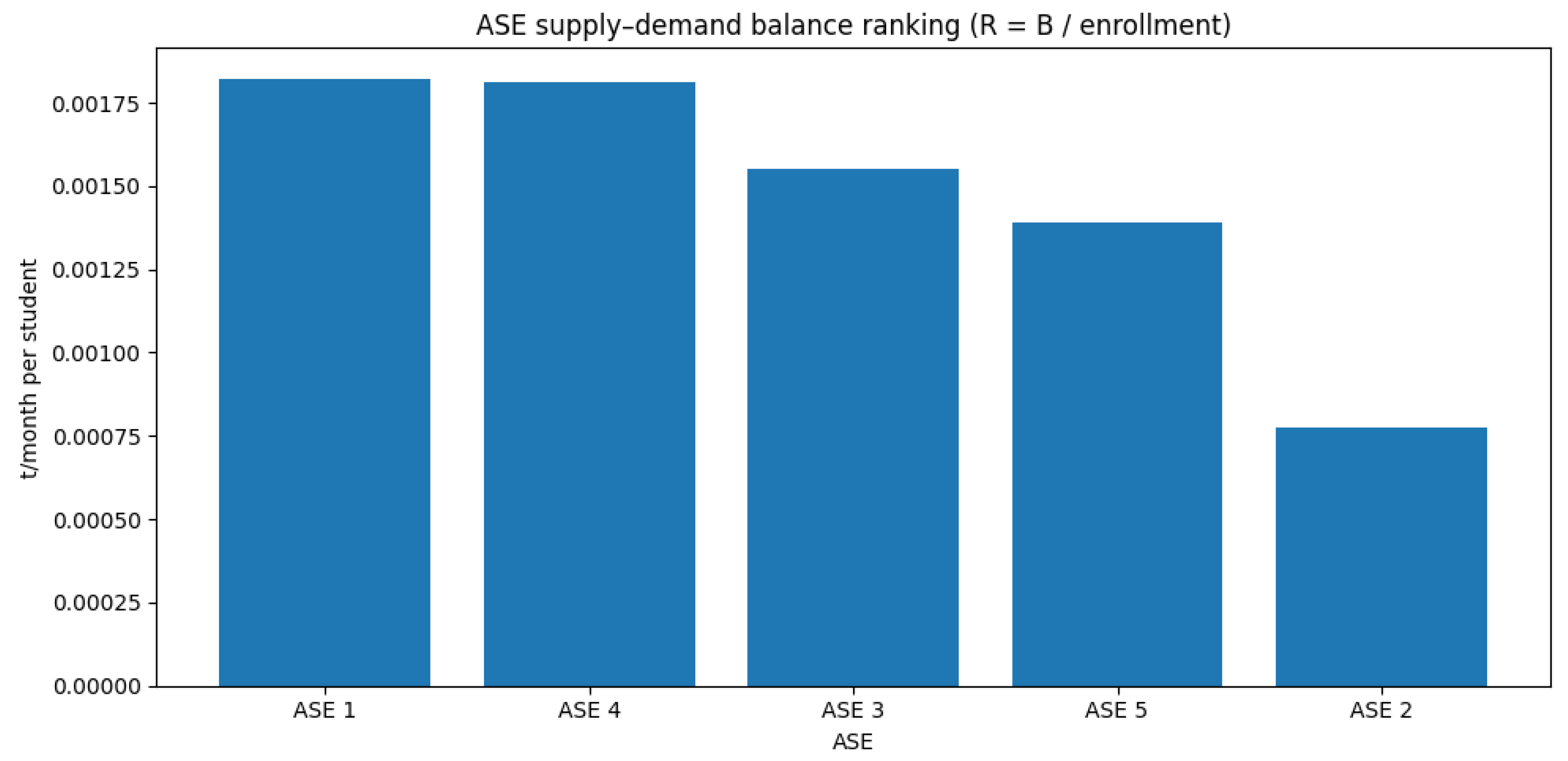 Figure 6 and synthesizes the territorial diagnostic of the proxy supply–demand relationship by ASE. The values allow ordering the ASE according to their relative availability of biomass with respect to aggregated educational demand. This indicator should be interpreted as a preliminary approximation, dependent on the spatial coverage of the considered demand nodes.
