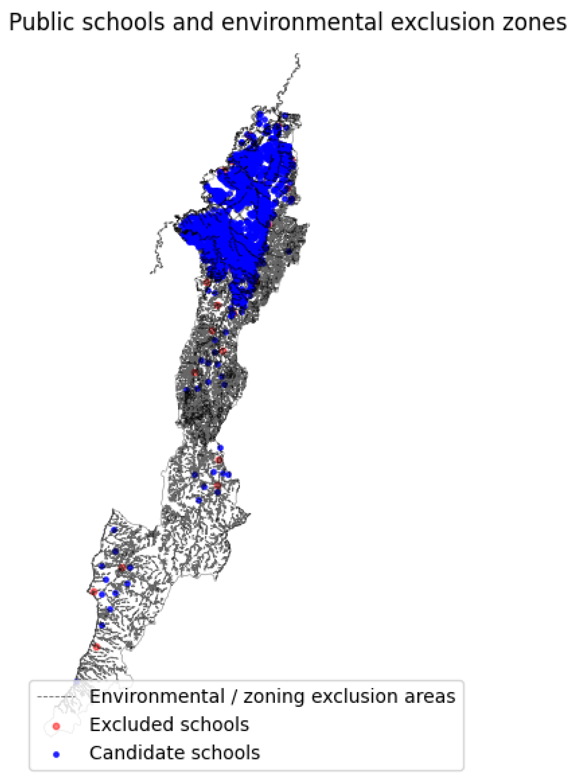 2. In terms of demand nodes, 80 out of 1979 district schools (4.04%) intersect the unbuffered exclusion geometry, while 112 schools (5.66%) intersect the buffered geometry. These figures show that the exclusion system has a strong territorial footprint, whereas its direct overlap with school demand nodes is comparatively limited. Because no additional thematic buffering was applied, the only supplementary threshold introduced by the workflow is the 10 m geometric tolerance, which is used exclusively to avoid borderline numerical/topological artifacts in spatial filtering rather than to impose an additional regulatory setback.