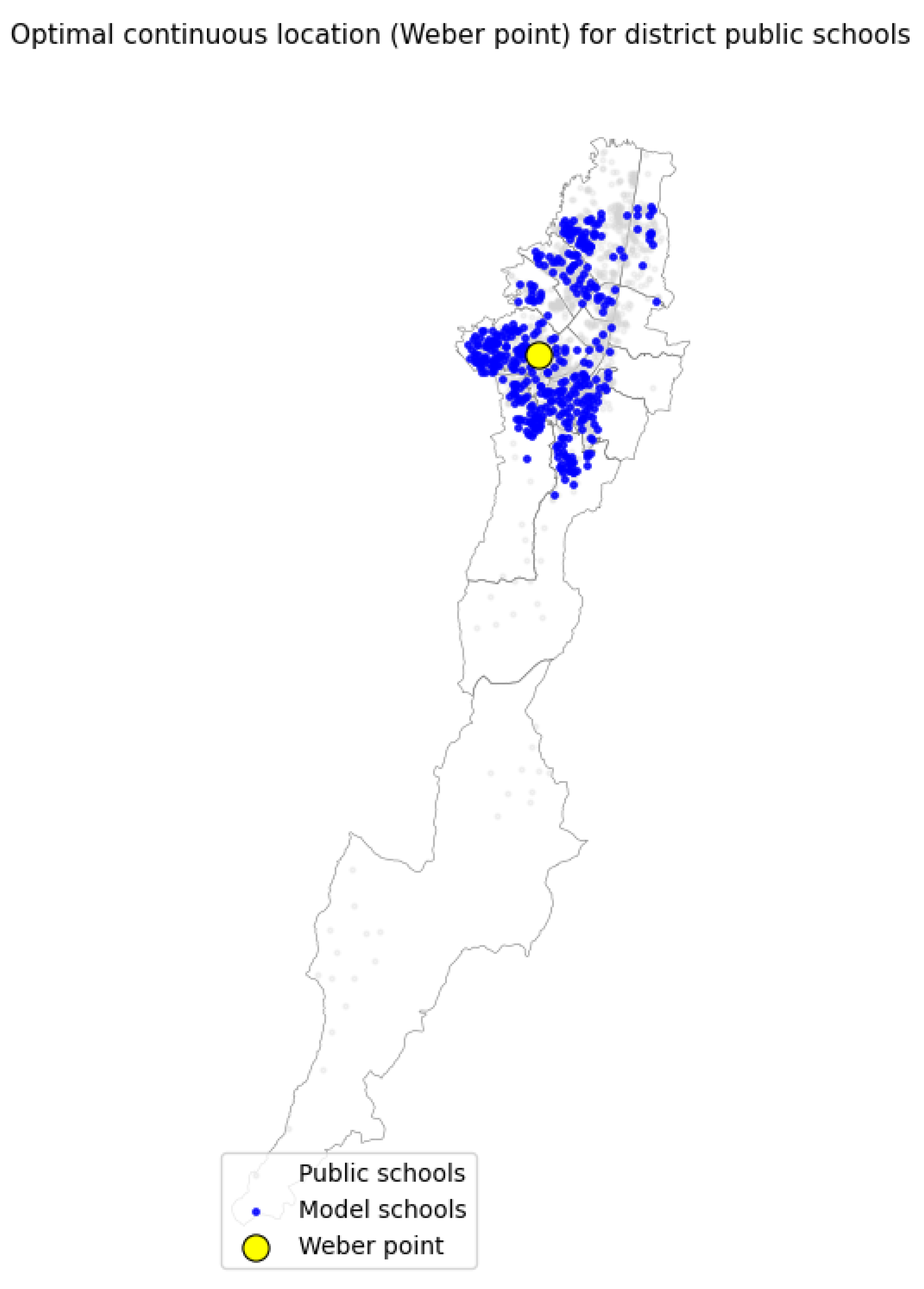 This distinction is important for interpretation. The Weber model is used only as an unconstrained geometric lower bound with respect to demand-weighted distance, whereas territorial feasibility is enforced afterwards through the GIS-based filtering and prioritization procedure. A capped subset of schools was used only in auxiliary exploratory/discrete routines for computational control and does not affect the Weber solution reported here.