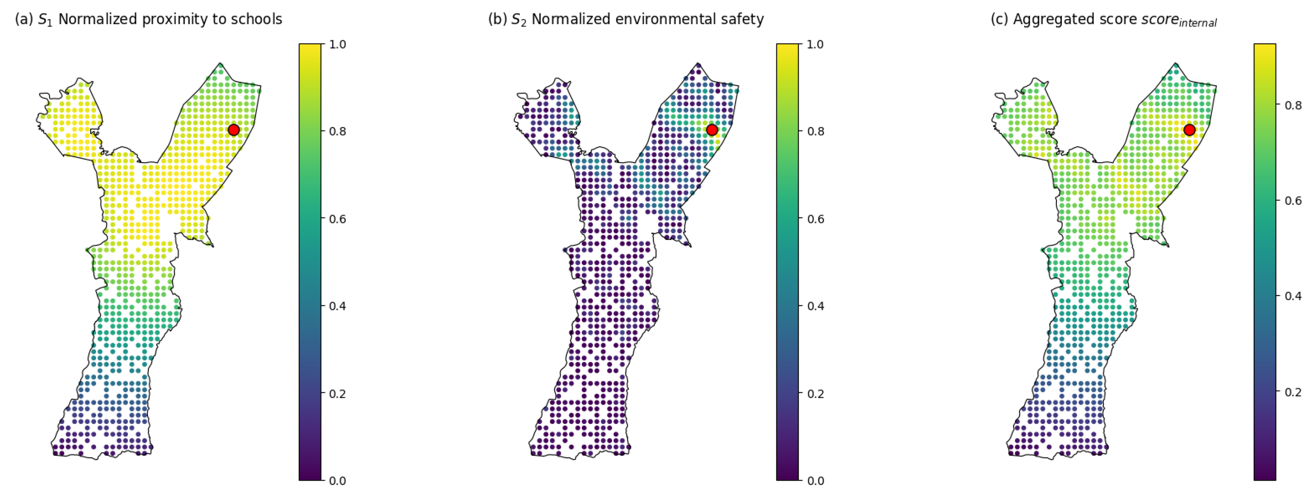 The intentionally reduced set of intra-ASE criteria reflects the role of this stage as a local spatial screening procedure based only on candidate-discriminating indicators that can be computed consistently from available GIS data at point level. In particular, demand-weighted proximity and environmental safety vary across candidate points within the same ASE and therefore provide discriminatory information for intra-zone ranking. By contrast, biomass availability is aggregated at the ASE level from operator records and does not vary among candidate points within a given ASE; for this reason, it is not included in the intra-ASE score and is incorporated only in the inter-ASE comparison.