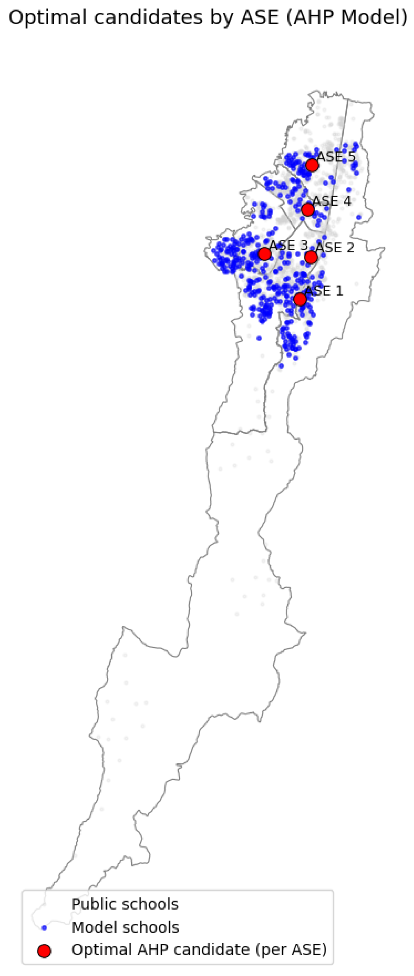 23]. In this study, AHP is implemented as a GIS-assisted territorial prioritization procedure structured in two hierarchical levels. The first level, referred to as intra-ASE, consists of the selection of a candidate point within each ASE through a multicriteria evaluation applied to a regular grid of spatial alternatives.