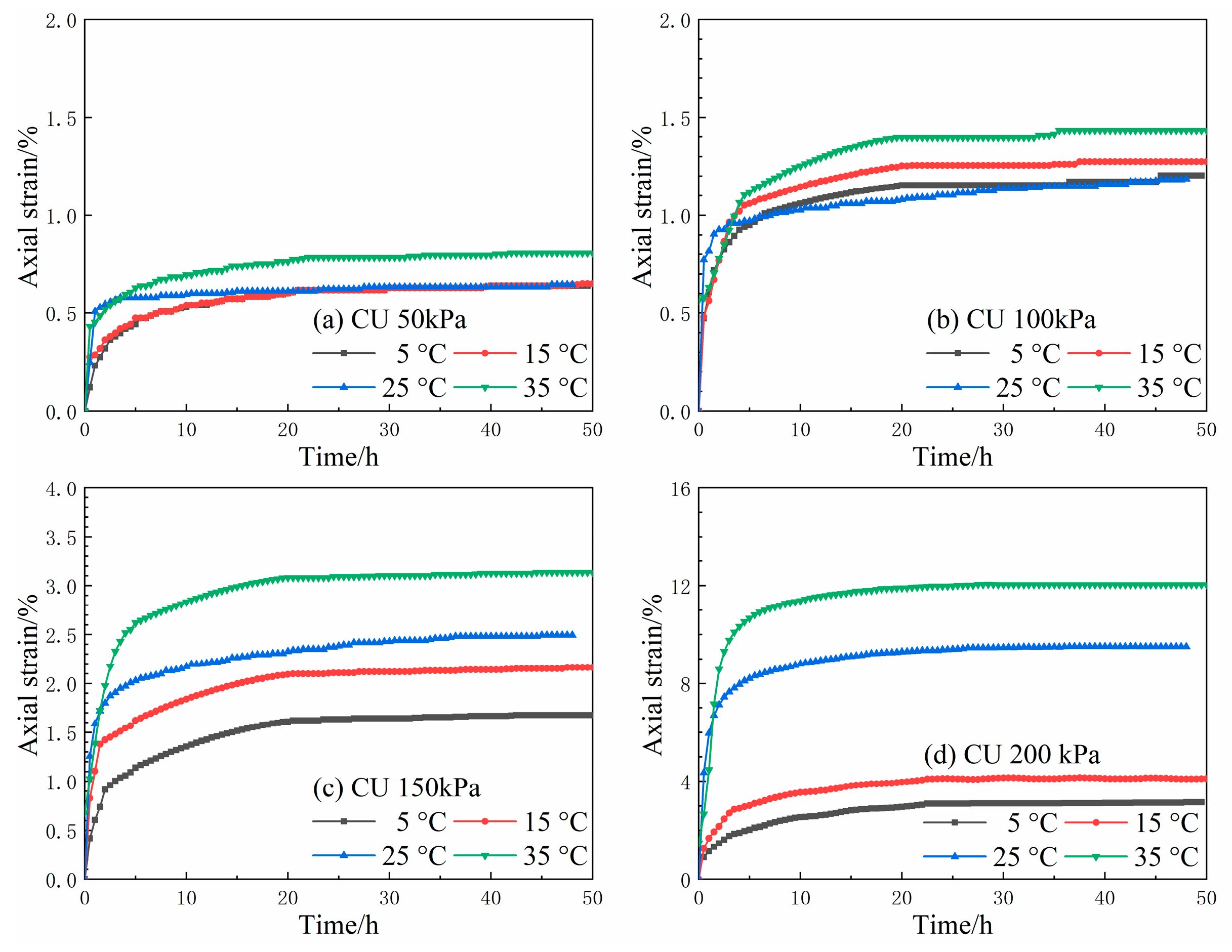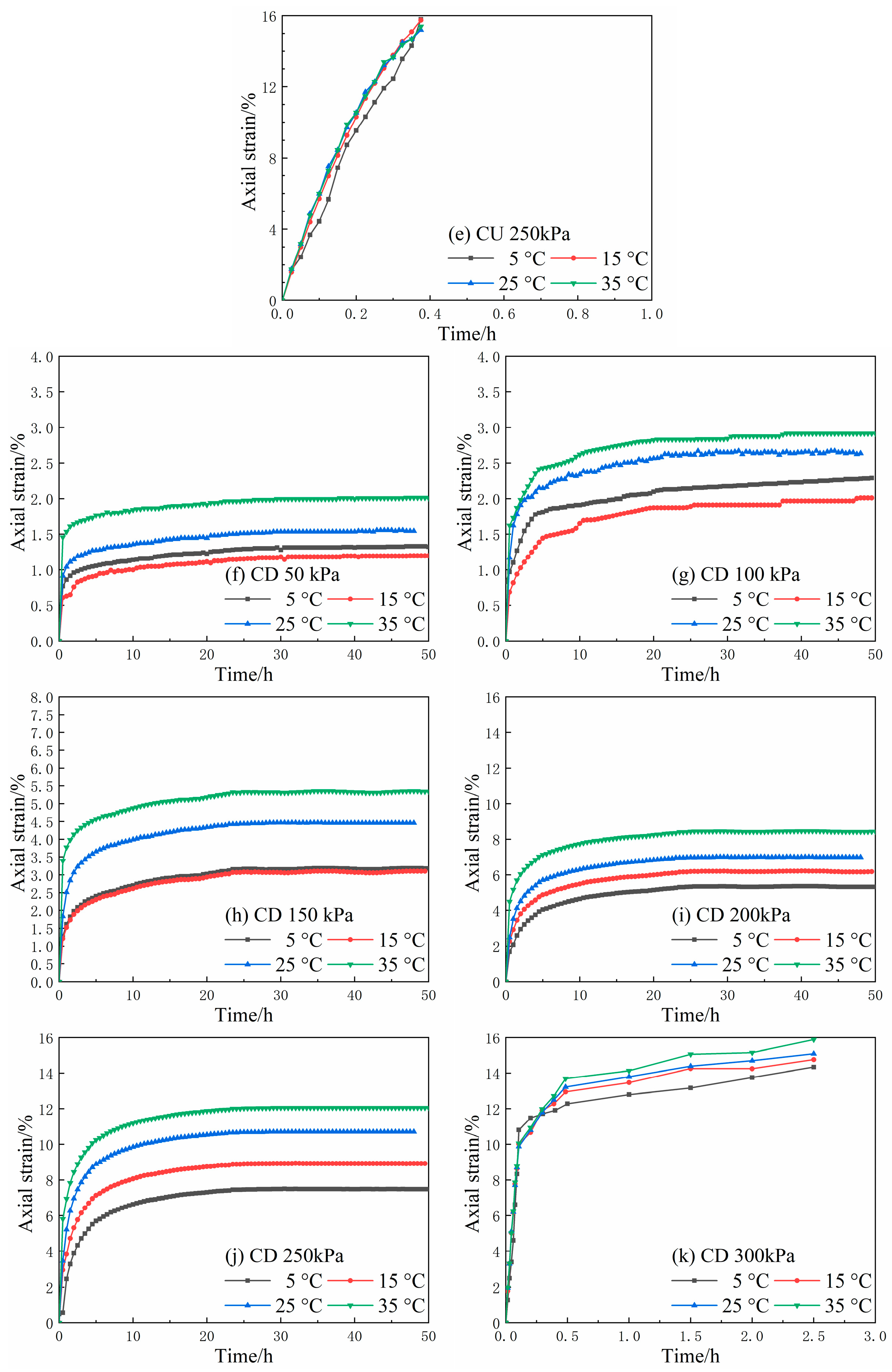 - Chen, Z.; Zhao, R.; Chen, W.; Wu, P.; Yin, J.; Feng, W. Effects of Temperature on the Time-Dependent Compression and Shear Behavior of a Soft Marine Clayey Soil. Eng. Geol. 2023, 314, 107005. [Google Scholar] [CrossRef]
