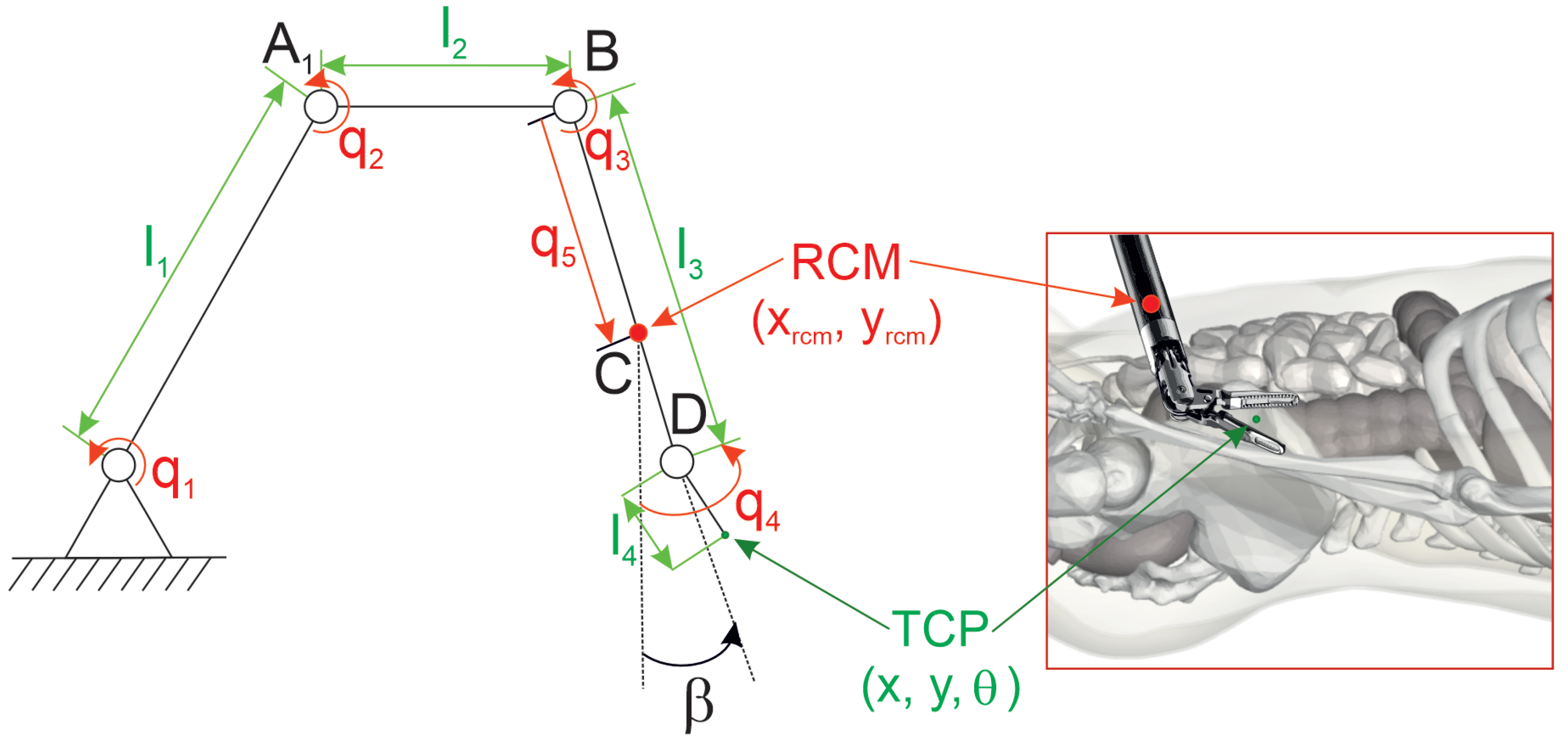 The additional complication in our case is the necessity of meeting the RCM constraint, i.e., ascertaining that the tool shaft (link 3) passes through a point .