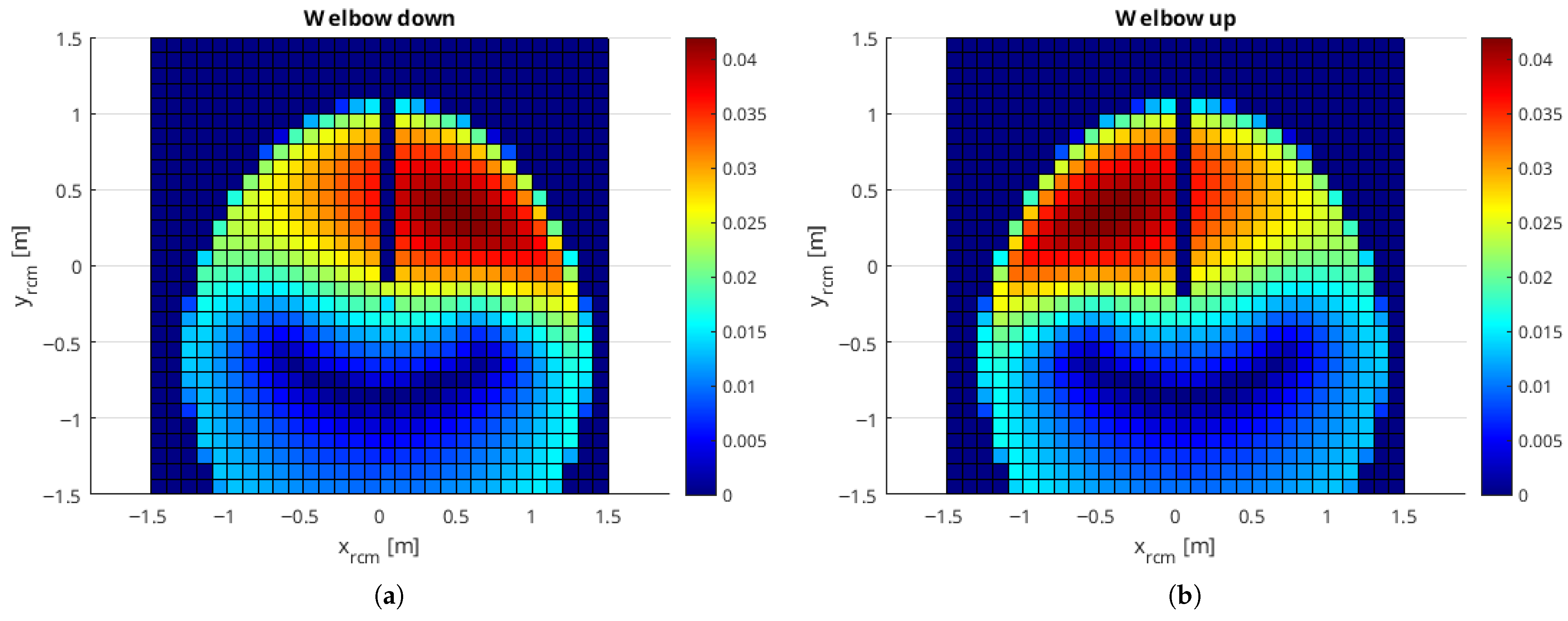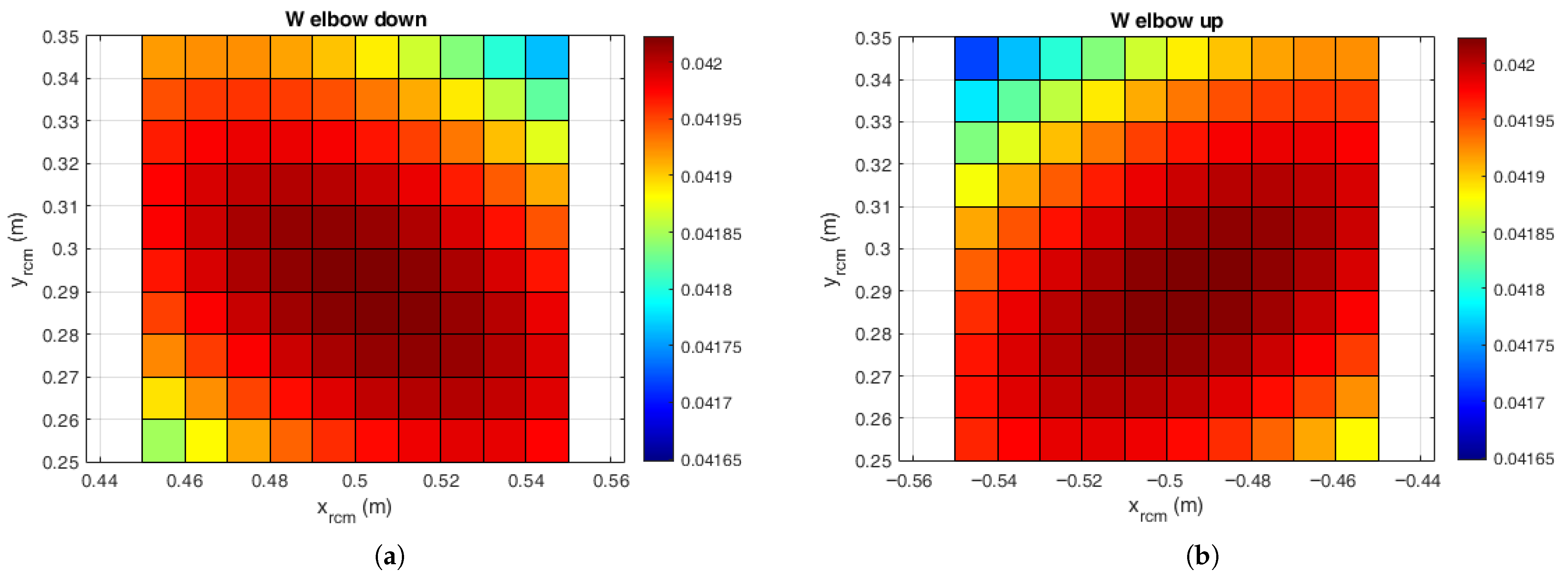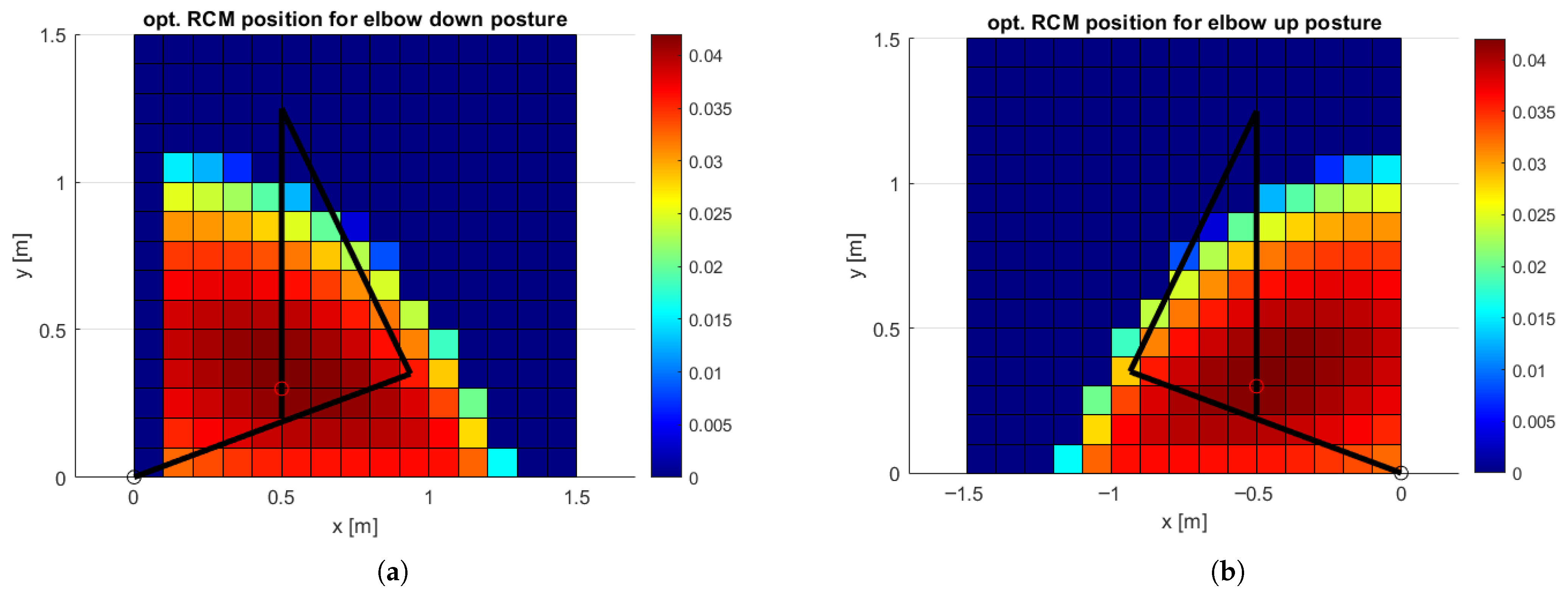 Figure 4a,b the sensitivity of the manipulability objective to small perturbations in the RCM position is shown for elbow-down and elbow-up postures, respectively. The results are shown for a displacement of the RCM point by