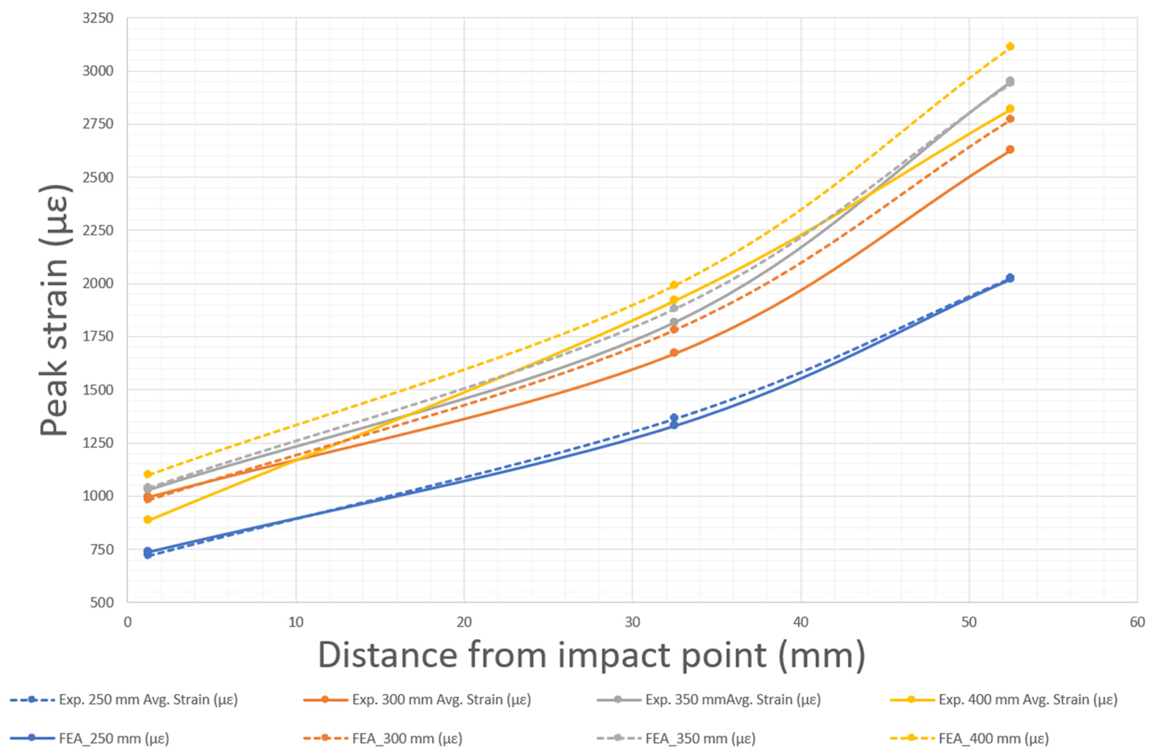 - Quantitative comparison between measured and simulated strain responses across multiple impact energy levels.