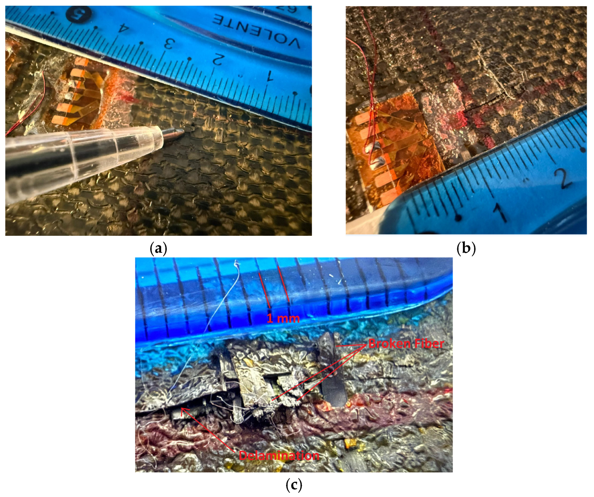 - Damage quantification and uncertainty: The current study correlates strain signatures with impact severity and visible damage features; future work should quantify internal damage using complementary NDT (e.g., ultrasonic C-scan) and report uncertainty bounds for strain-based diagnostics.
