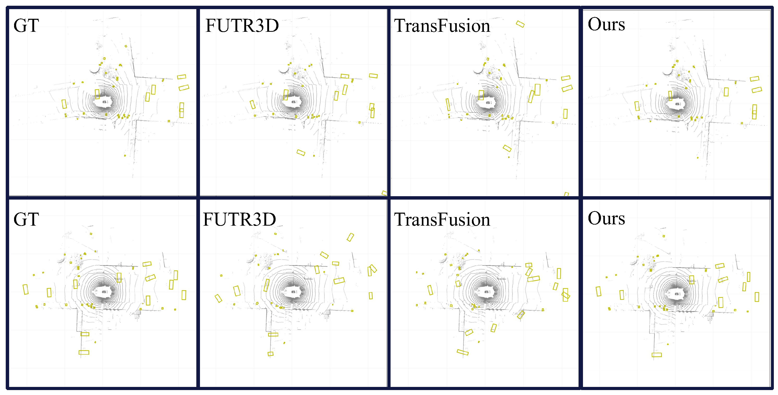- Chen, X.; Zhang, T.; Wang, Y.; Wang, Y.; Zhao, H. FUTR3D: A Unified Sensor Fusion Framework for 3D Detection. In Proceedings of the IEEE/CVF Conference on Computer Vision and Pattern Recognition, CVPR 2023—Workshops, Vancouver, BC, Canada, 17–24 June 2023; IEEE: New York, NY, USA, 2023; pp. 172–181. [Google Scholar] [CrossRef]